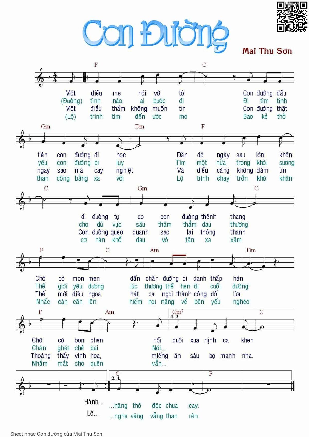 Mai Thu Sơn Một điều mẹ nói với tôi Con đường đầu tiên con đường đi học [PDF] [Sheet] [Lời H.A] [Mp4/Midi]