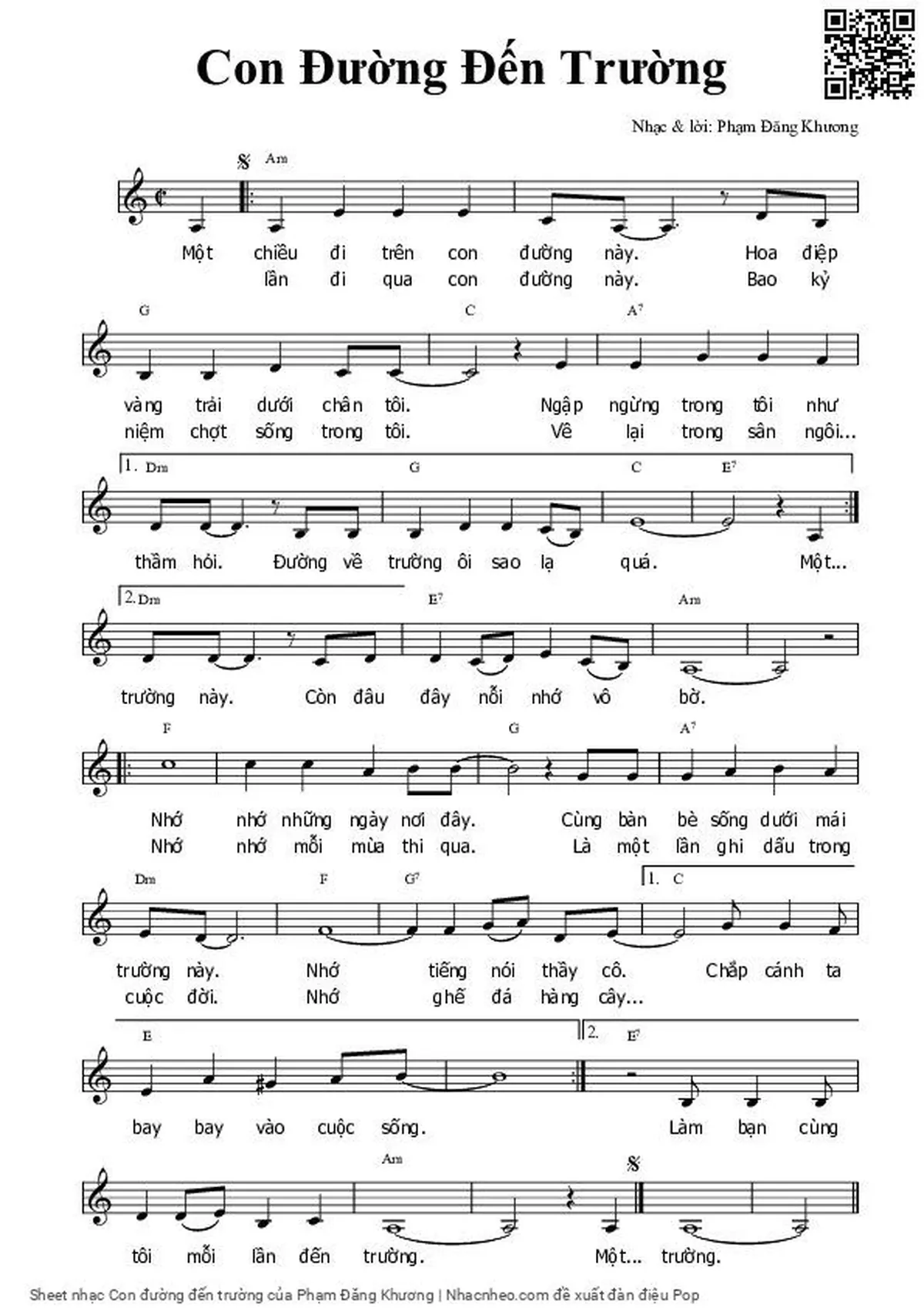 Chọn nút dấu + để tăng tông lên nửa cung, nút dấu - để giảm tông xuống nửa cung. Rê chuột vào hợp âm để xem các thế bấm hợp âm của bài hát Con đường đến trường.