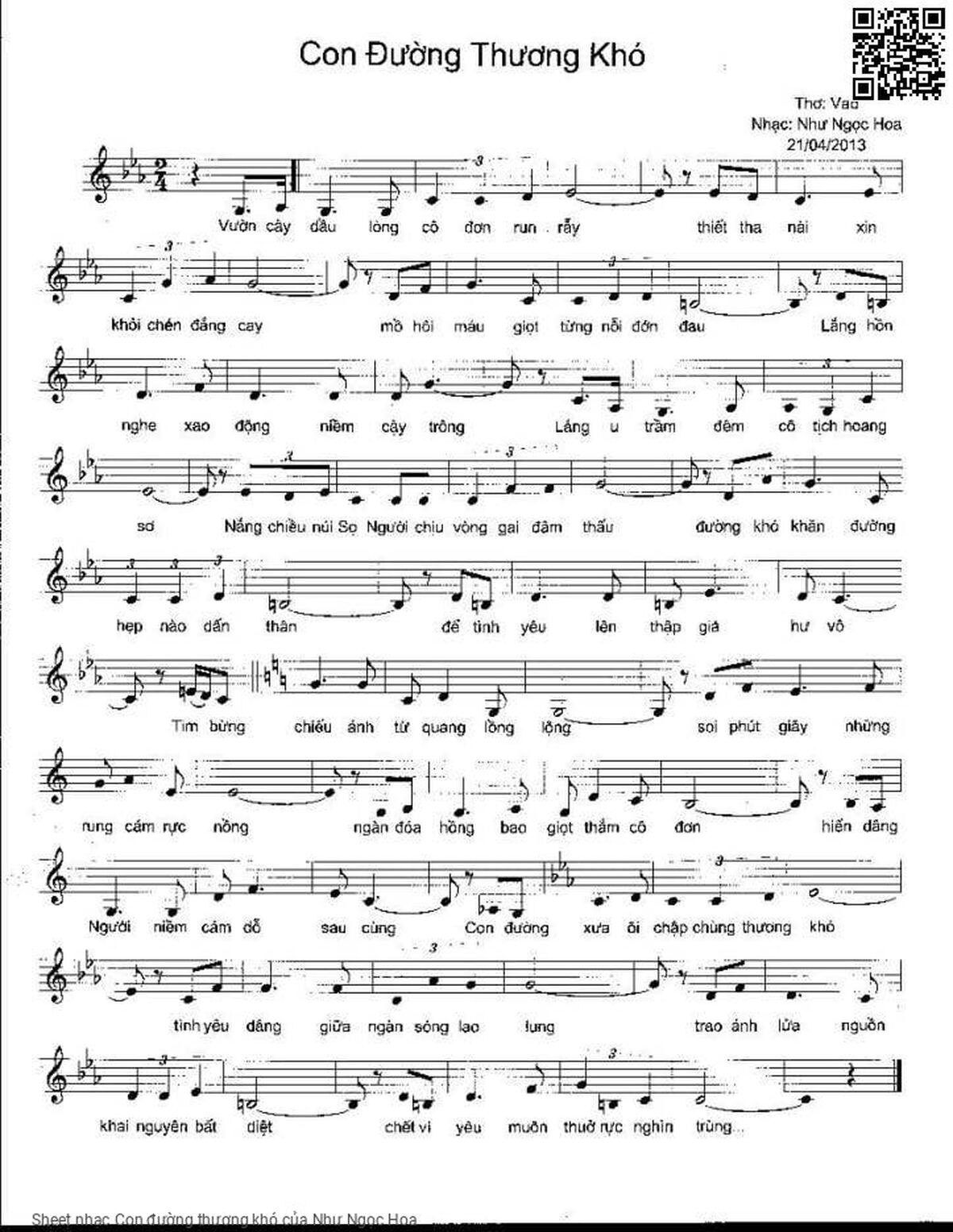 Phần nghe hát Con đường thương khó (Như Ngọc Hoa) được nhúng từ Youtube, Musescore hoặc link ngoài và chịu sự kiểm soát bản quyền của bên thứ ba đó, vì vậy có thể bị xóa hoặc chèn quảng cáo bất kỳ lúc nào. Nếu bạn không nghe - xem được ca sĩ hát tức là đã bị Youtube hoặc Musescore kiểm soát.