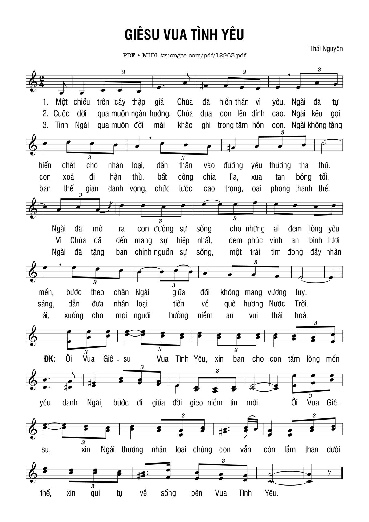 Điệp khúc. Ôi Vua Giê-su Vua Tình Yêu xin ban cho con tấm lòng mến yêu, danh Ngài bước đi giữa đời gieo niềm tin mới. Ôi Vua Giê-su xin Ngài thương nhân loại chúng con vẫn còn lầm than dưới thế, xin quy tụ về sống bên Vua Tình Yêu.