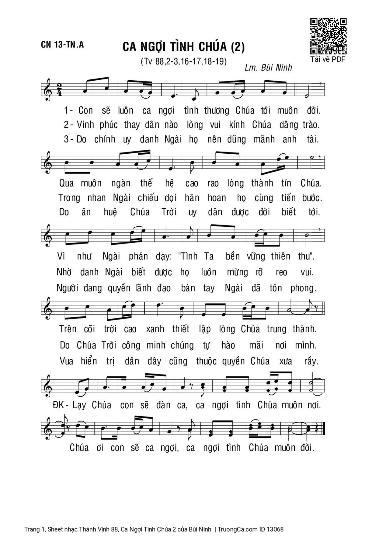 Phần nghe hát Thánh Vịnh 88, Ca Ngợi Tình Chúa 2 (Bùi Ninh) được nhúng từ Youtube, Musescore hoặc link ngoài và chịu sự kiểm soát bản quyền của bên thứ ba đó, vì vậy có thể bị xóa hoặc chèn quảng cáo bất kỳ lúc nào. Nếu bạn không nghe - xem được ca sĩ hát tức là đã bị Youtube hoặc Musescore kiểm soát.