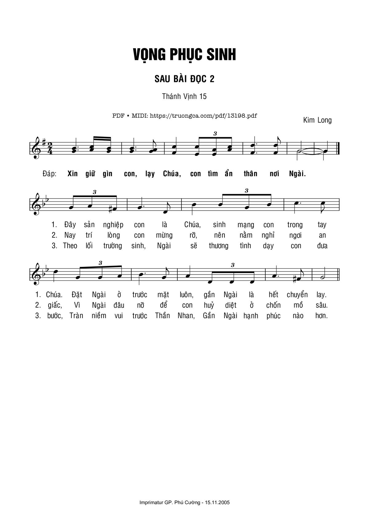 Phần nghe hát Thánh Vịnh 15, Vọng Phục Sinh (bài 2 (Kim Long) được nhúng từ Youtube, Musescore hoặc link ngoài và chịu sự kiểm soát bản quyền của bên thứ ba đó, vì vậy có thể bị xóa hoặc chèn quảng cáo bất kỳ lúc nào. Nếu bạn không nghe - xem được ca sĩ hát tức là đã bị Youtube hoặc Musescore kiểm soát.