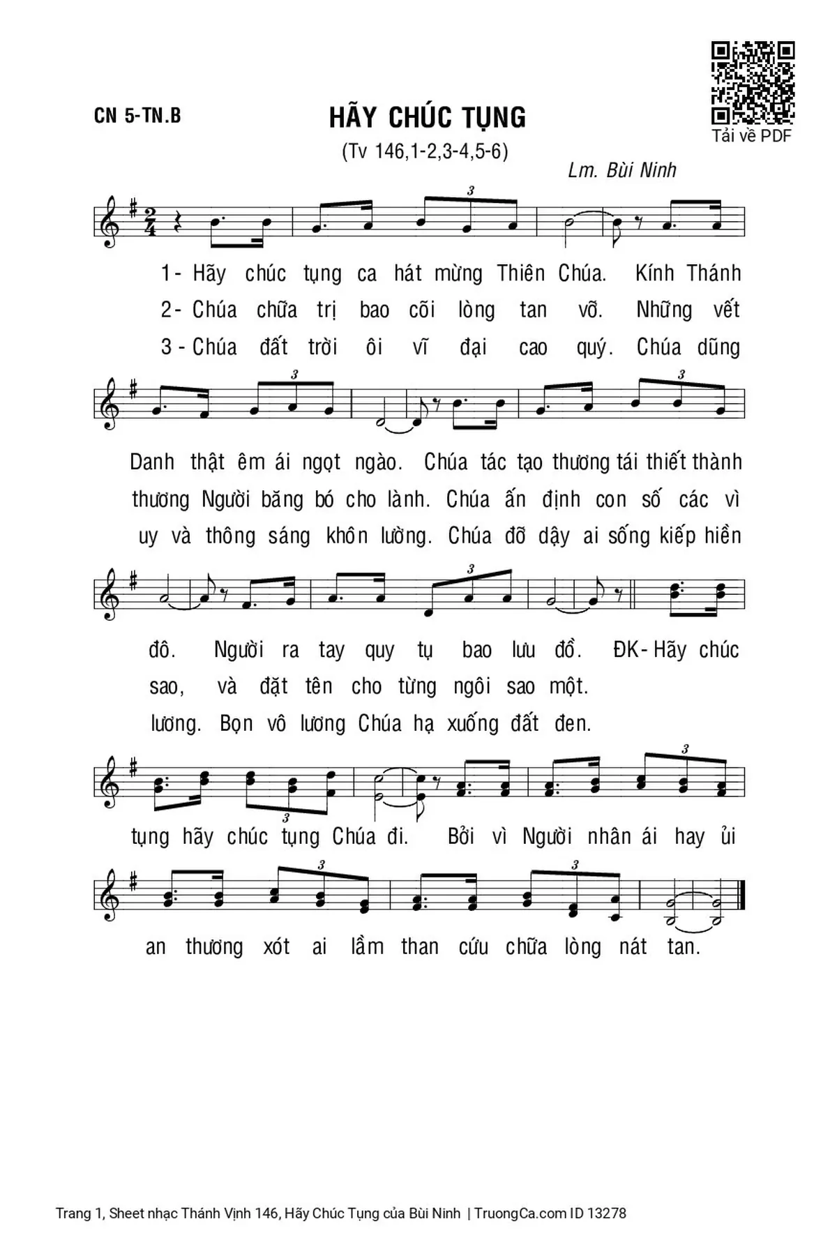 Phần nghe hát Thánh Vịnh 146, Hãy Chúc Tụng (Bùi Ninh) được nhúng từ Youtube, Musescore hoặc link ngoài và chịu sự kiểm soát bản quyền của bên thứ ba đó, vì vậy có thể bị xóa hoặc chèn quảng cáo bất kỳ lúc nào. Nếu bạn không nghe - xem được ca sĩ hát tức là đã bị Youtube hoặc Musescore kiểm soát.