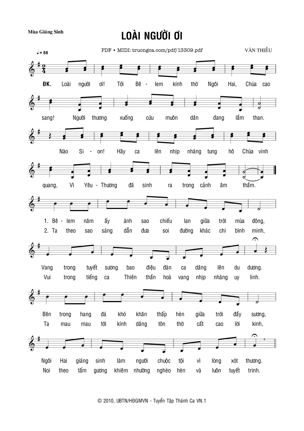 Điệp khúc. Loài người ơi tới Bêlem kính thờ Ngôi Hai Chúa cao sang, Người sinh xuống cứu muôn dân đang lầm than. Nào Sion hãy ca lên nhịp nhàng tung hô, Chúa vinh quang, vì yêu thương đã sinh ra trong cảnh âm thầm.