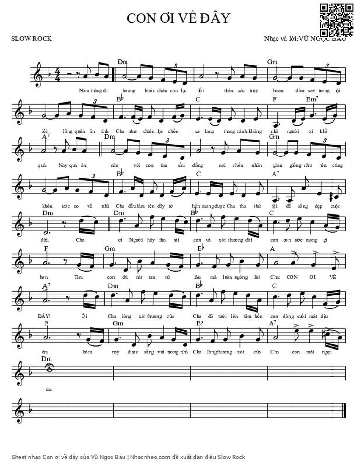 Chọn nút dấu + để tăng tông lên nửa cung, nút dấu - để giảm tông xuống nửa cung. Rê chuột vào hợp âm để xem các thế bấm hợp âm của bài hát Con ơi về đây.