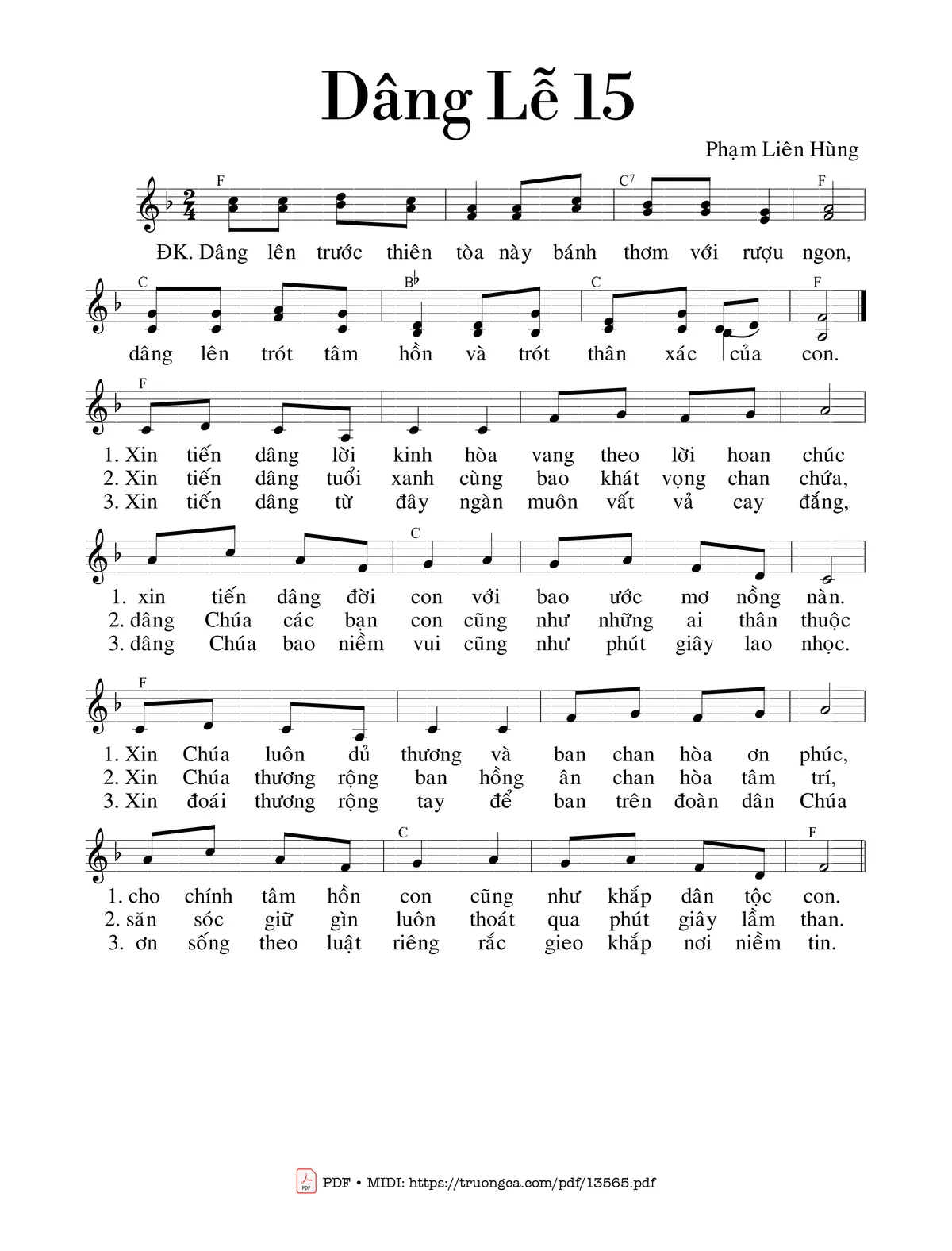 Chọn nút dấu + để tăng tông lên nửa cung, nút dấu - để giảm tông xuống nửa cung. Rê chuột vào hợp âm để xem các thế bấm hợp âm của bài hát Dâng Lễ 15.