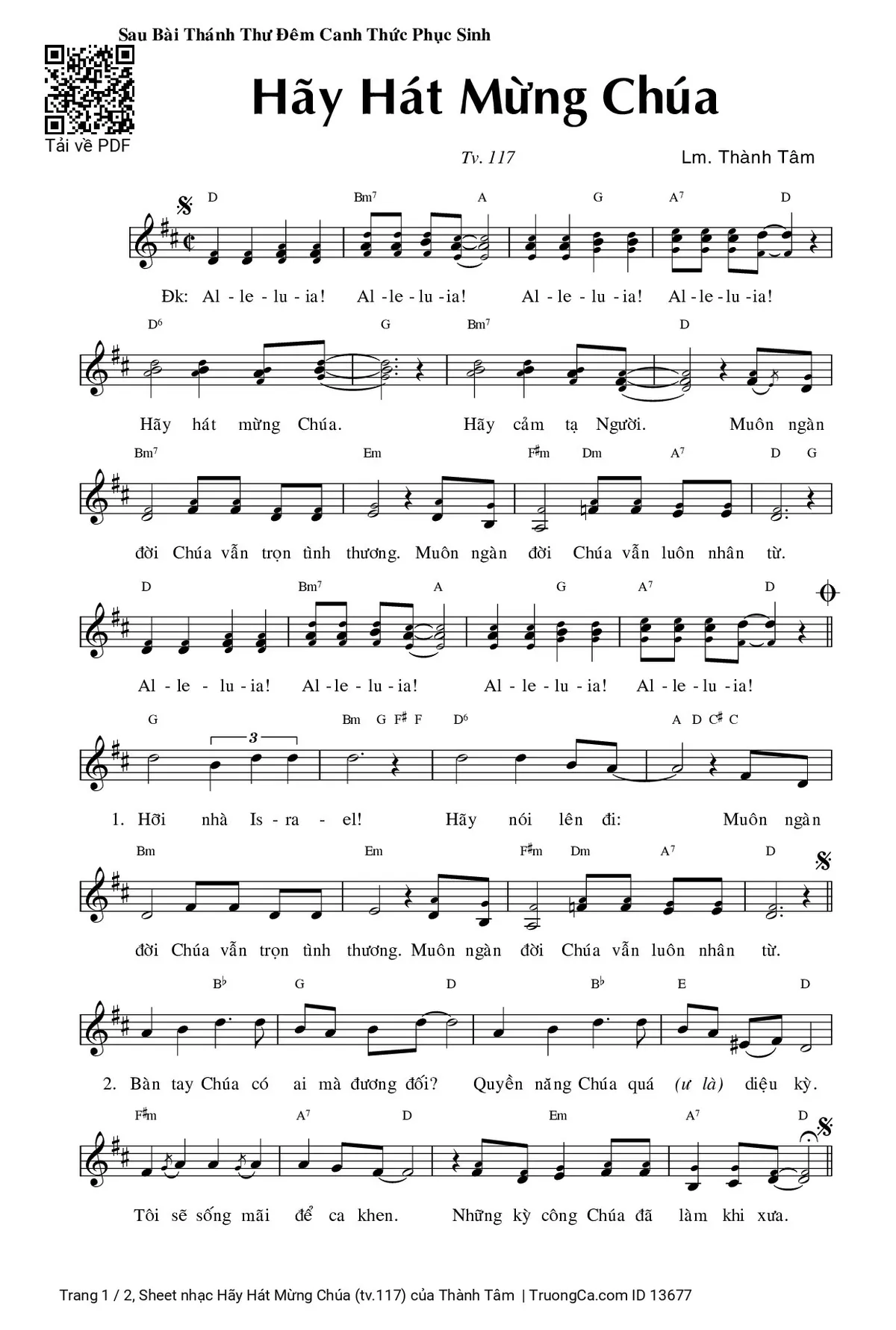 Điệp khúc. Al-le-lu-ia! Al-le-lu-ia! Al-le-lu-ia! Al-le-lu-ia! Hãy hát mừng Chúa. Hãy cảm tạ Người. Muôn ngàn đời Chúa vẫn trọn tình thương. Muôn ngàn đời Chúa vẫn luôn nhân từ. Al-le-lu-ia! Al-le-lu-ia! Al-le-lu-ia! Al-le-lu-ia!