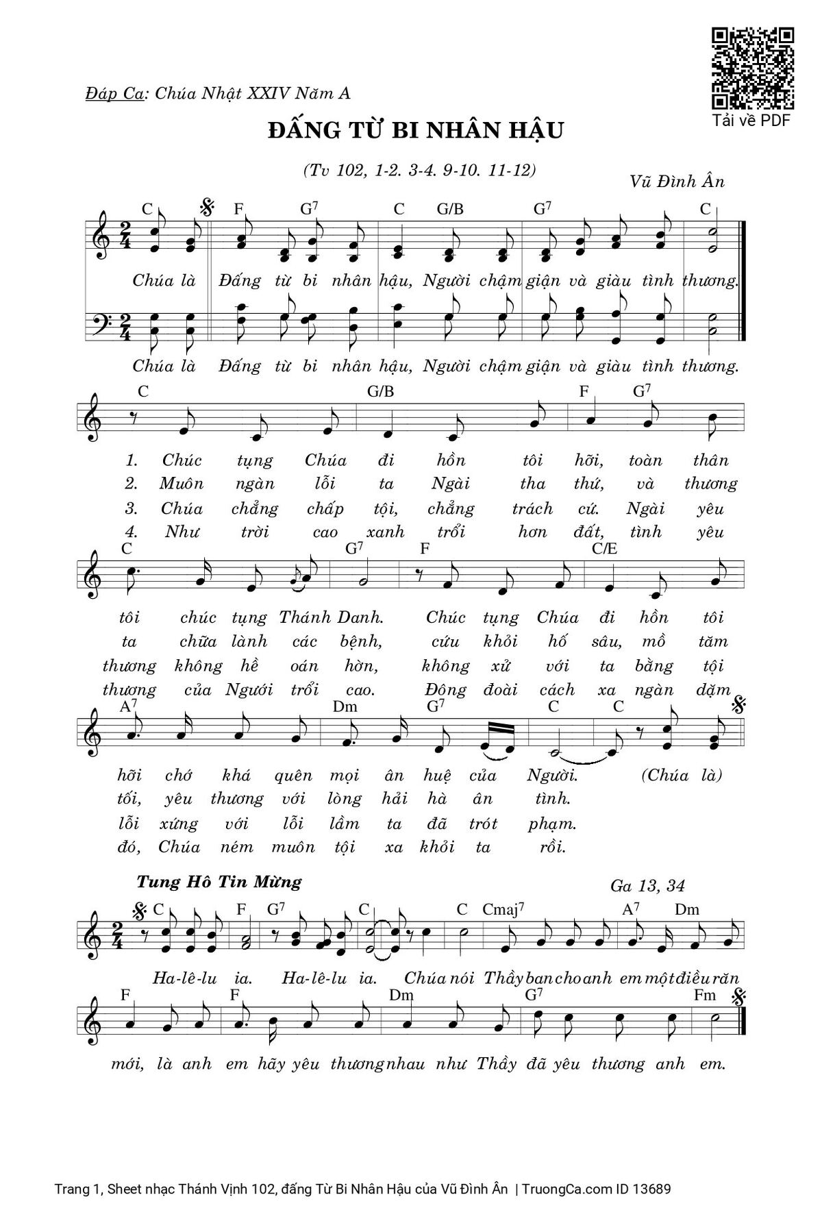 Phần nghe hát Thánh Vịnh 102, đấng Từ Bi Nhân Hậu (Vũ Đình Ân) được nhúng từ Youtube, Musescore hoặc link ngoài và chịu sự kiểm soát bản quyền của bên thứ ba đó, vì vậy có thể bị xóa hoặc chèn quảng cáo bất kỳ lúc nào. Nếu bạn không nghe - xem được ca sĩ hát tức là đã bị Youtube hoặc Musescore kiểm soát.
