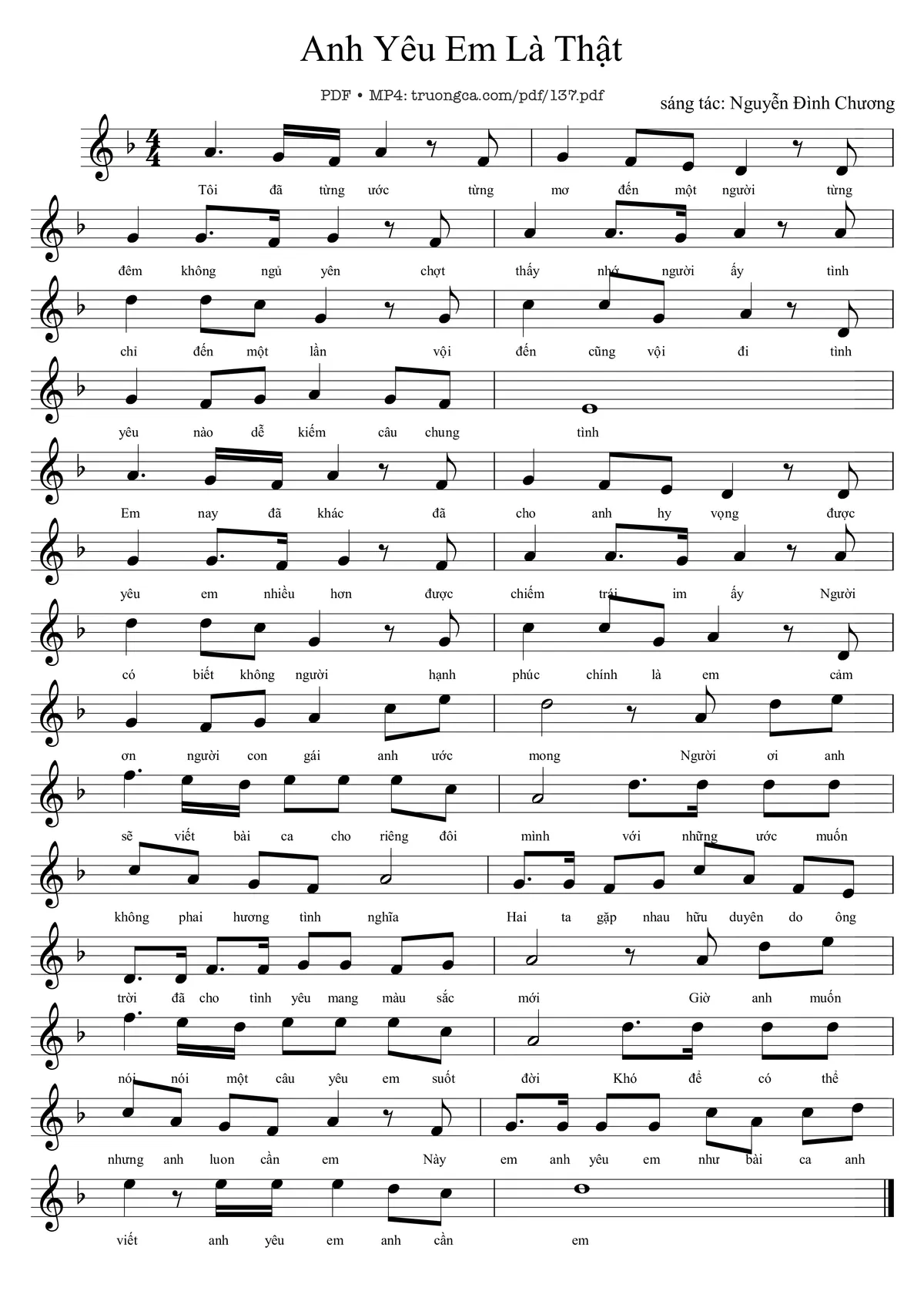 Chọn nút dấu + để tăng tông lên nửa cung, nút dấu - để giảm tông xuống nửa cung. Rê chuột vào hợp âm để xem các thế bấm hợp âm của bài hát Anh yêu em là thật.