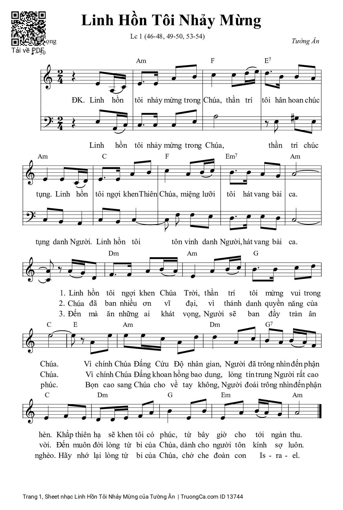 1. Linh hồn tôi ngợi khen Chúa Trời, thần trí tôi mừng vui trong Chúa. Vì chính Chúa Đấng Cứu Độ nhân gian, Người đã trông nhìn đến phận hèn. Khắp thiên hạ sẽ khen tôi có phúc, từ bây giờ cho tới ngàn thu.