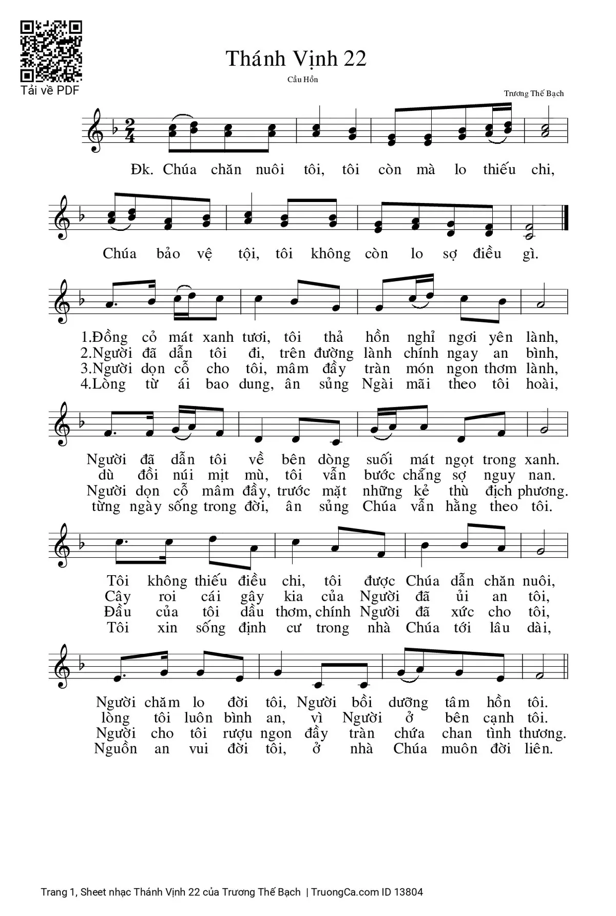 1. Đồng cỏ mát xanh tươi, tôi thả hồn nghỉ ngơi yên lành, Người đã dẫn tôi về bên dòng suối mát ngọt trong xanh. Tôi không thiếu điều chi, tôi được Chúa dẫn chăn nuôi, Người chăm lo đời tôi, Người bồi dưỡng tâm hồn tôi.