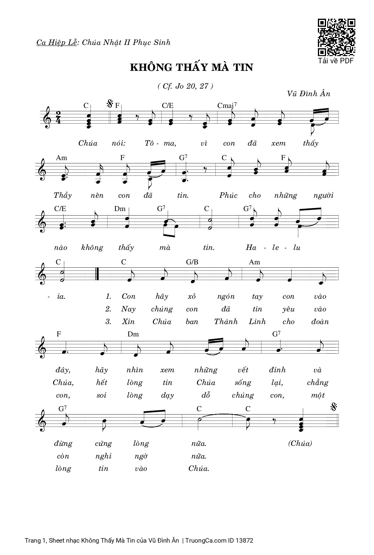 Điệp khúc. Chúa nói Tô-ma, vì con đã xem thấy Thầy nên con đã tin. Phúc cho những người nào không thấy mà tin. Ha-le-lu-ia!.