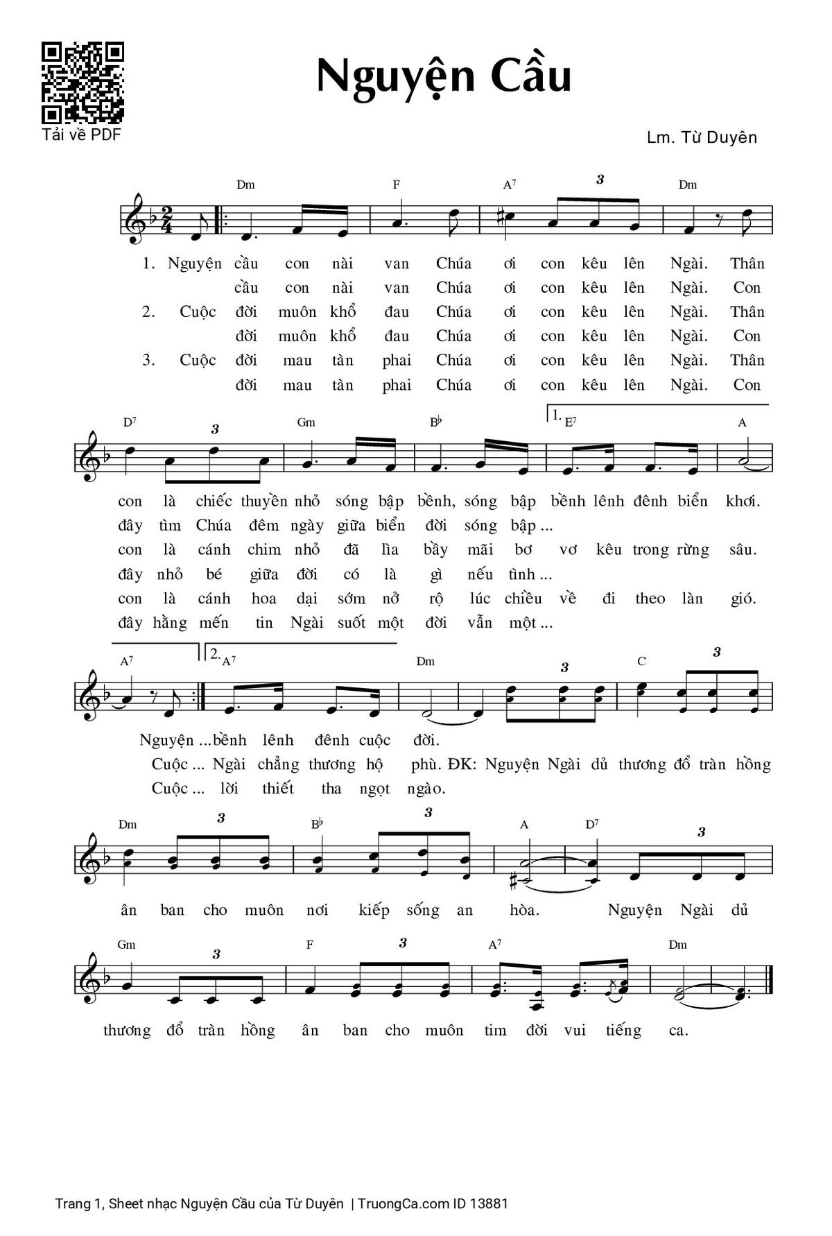 Chọn nút dấu + để tăng tông lên nửa cung, nút dấu - để giảm tông xuống nửa cung. Rê chuột vào hợp âm để xem các thế bấm hợp âm của bài hát Nguyện Cầu.