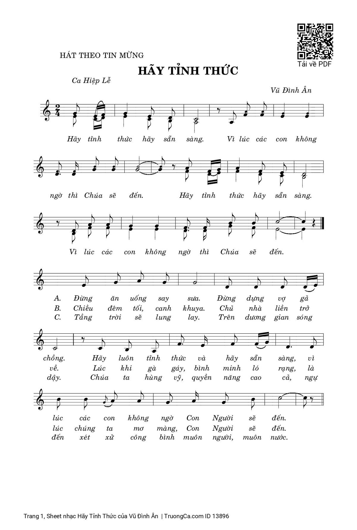 Phần nghe hát Hãy Tỉnh Thức (Vũ Đình Ân) được nhúng từ Youtube, Musescore hoặc link ngoài và chịu sự kiểm soát bản quyền của bên thứ ba đó, vì vậy có thể bị xóa hoặc chèn quảng cáo bất kỳ lúc nào. Nếu bạn không nghe - xem được ca sĩ hát tức là đã bị Youtube hoặc Musescore kiểm soát.