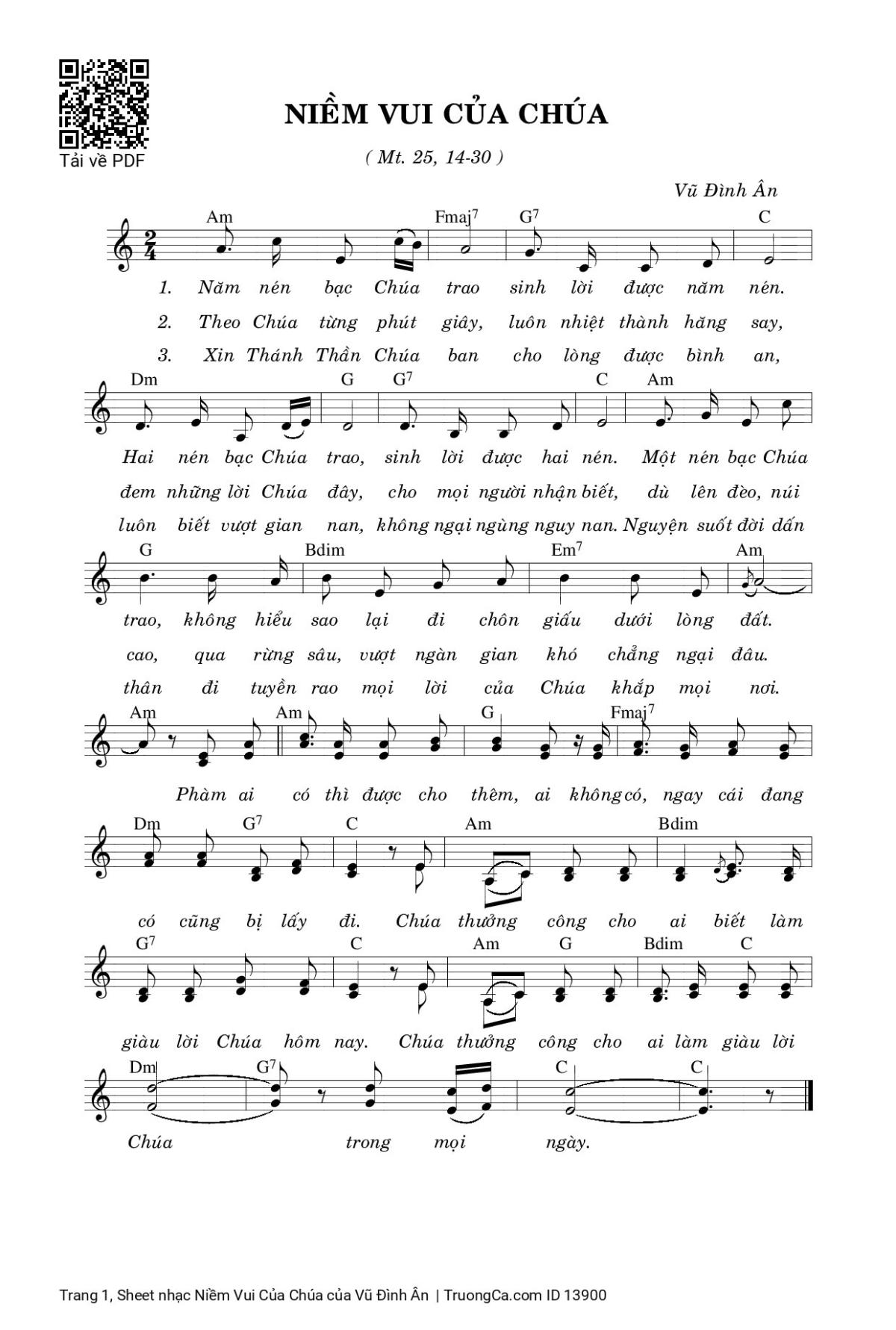 Phần nghe hát Niềm Vui Của Chúa (Vũ Đình Ân) được nhúng từ Youtube, Musescore hoặc link ngoài và chịu sự kiểm soát bản quyền của bên thứ ba đó, vì vậy có thể bị xóa hoặc chèn quảng cáo bất kỳ lúc nào. Nếu bạn không nghe - xem được ca sĩ hát tức là đã bị Youtube hoặc Musescore kiểm soát.