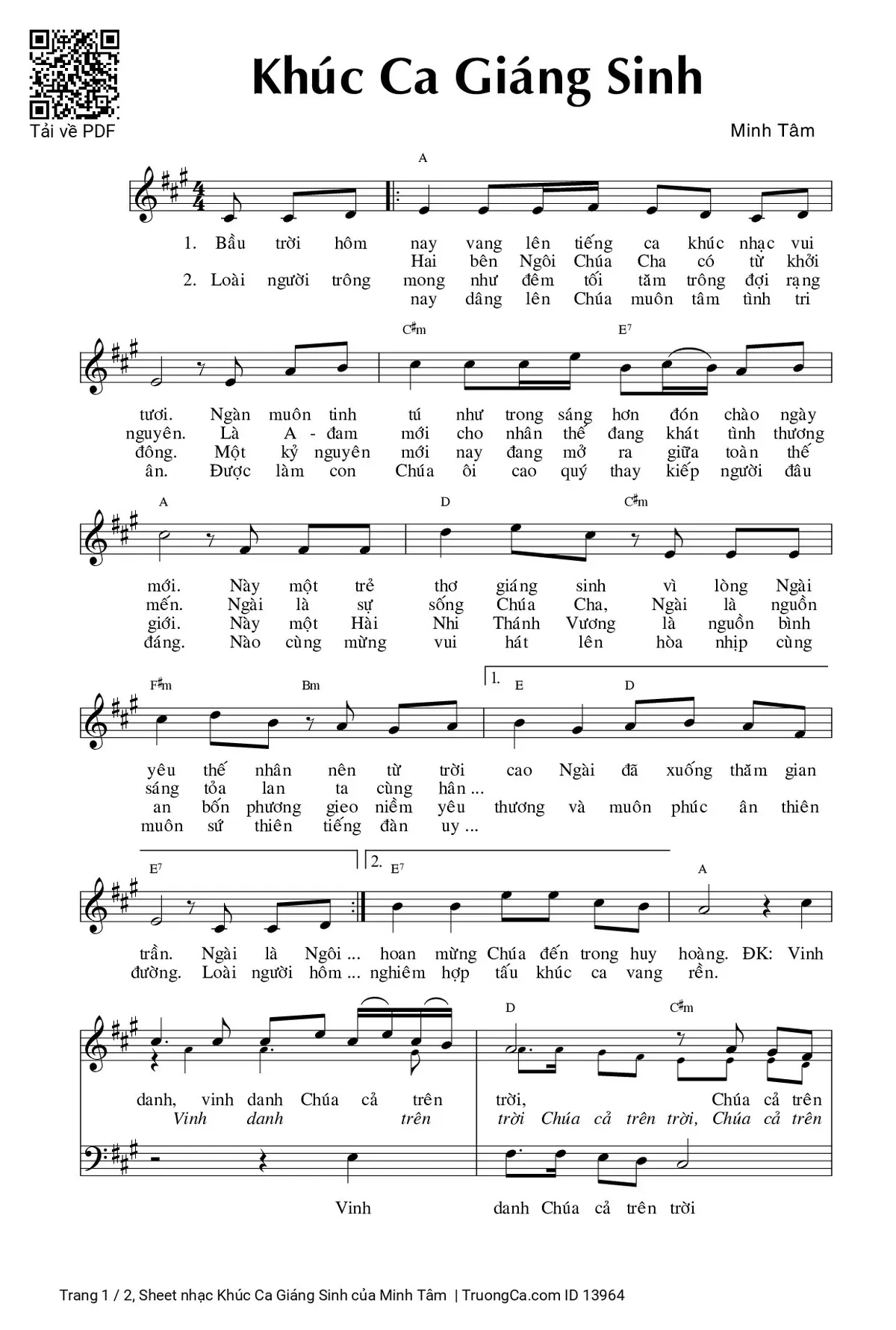 Điệp khúc: Vinh danh, vinh danh Chúa cả trên trời, Chúa cả trên trời. Và bình an, bình an dưới thế cho người Chúa thương. Tung hô, tung hô Chúa Cha trên trời, Chúa Cha trên trời.Và Ngôi Hai cùng với Ngôi Ba hiển vinh muôn đời.