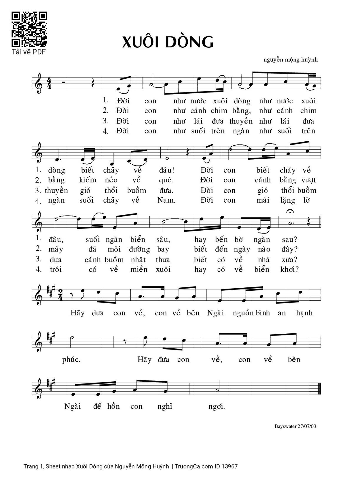 Phần nghe hát Xuôi Dòng (Nguyễn Mộng Huỳnh) được nhúng từ Youtube, Musescore hoặc link ngoài và chịu sự kiểm soát bản quyền của bên thứ ba đó, vì vậy có thể bị xóa hoặc chèn quảng cáo bất kỳ lúc nào. Nếu bạn không nghe - xem được ca sĩ hát tức là đã bị Youtube hoặc Musescore kiểm soát.