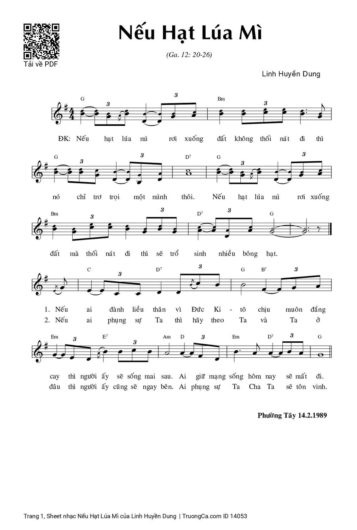 Điệp khúc. Nếu hạt lúa mì rơi xuống đất, không thối nát đi thì nó chỉ trơ trọi một mình tôi. Nếu hạt lúa mì rơi xuống đất, mà thối nát đi thì nó sẽ trổ sinh nhiều bông hạt.