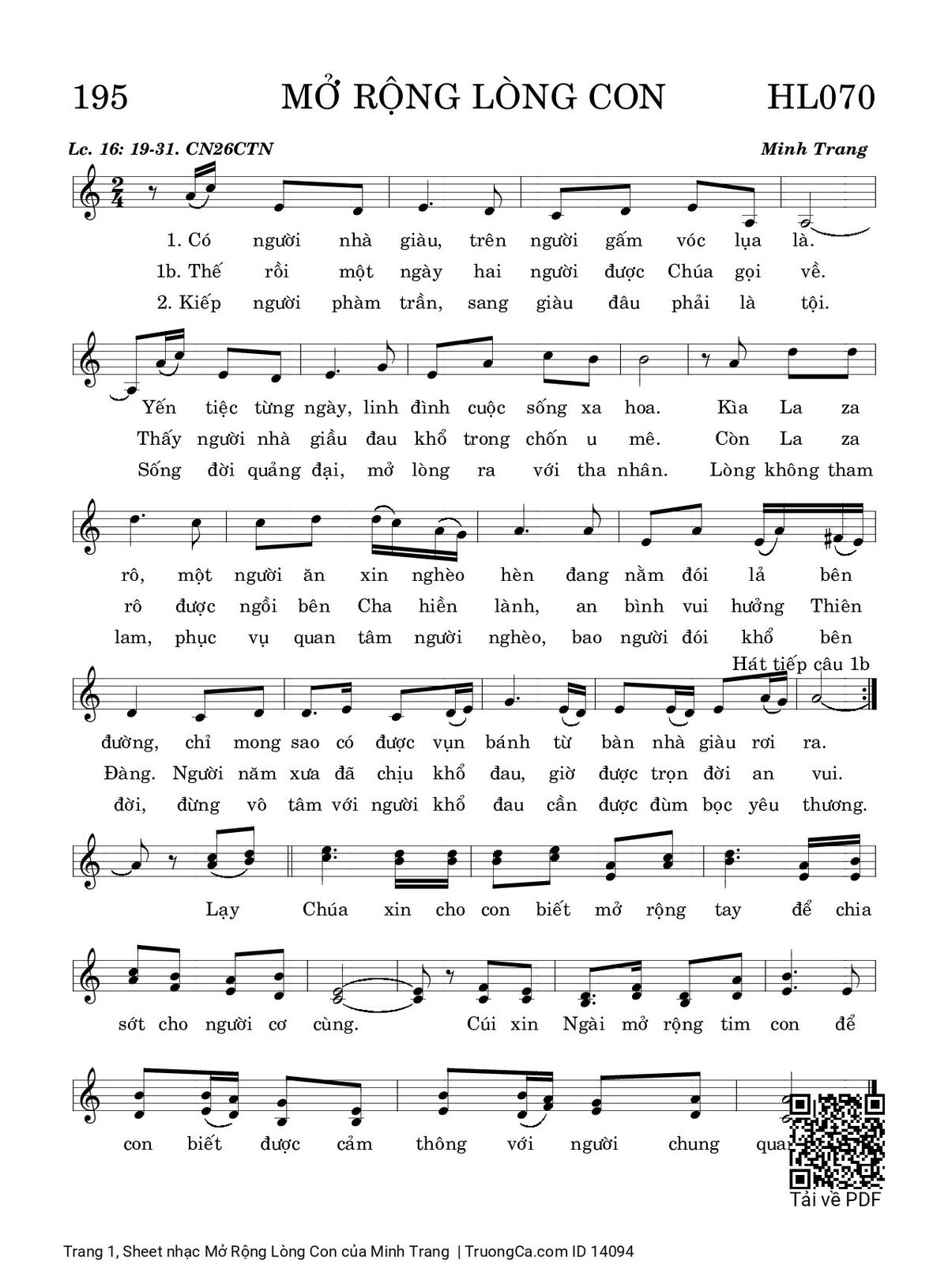 Điệp khúc. Lạy Chúa xin cho con biết mở rộng tay để chia sớt cho người cơ cùng. Cúi xin Ngài mở rộng tim con để con biết được cảm thông với người chung quanh.