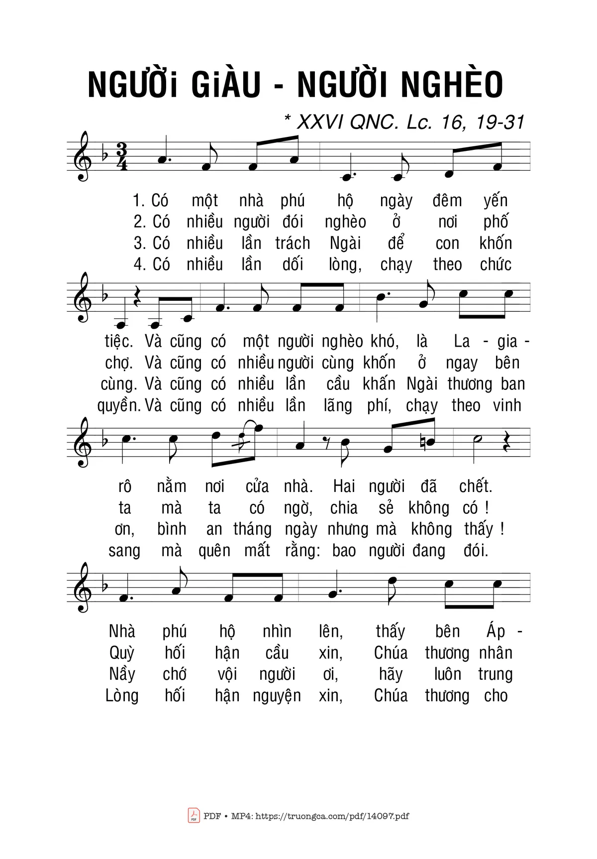 1. Có một nhà phú hộ ngày đêm yến tiệc. Và cũng có một người nghèo khó, là La-gia-rô nằm nơi cửa nhà. Hai người đã chết. Nhà phú hộ nhìn lên, thấy bên Áp-ram là La-gia-rô. Thế mới biết Ngài rất công minh, tình Chúa khoan dung với ai khốn cùng.