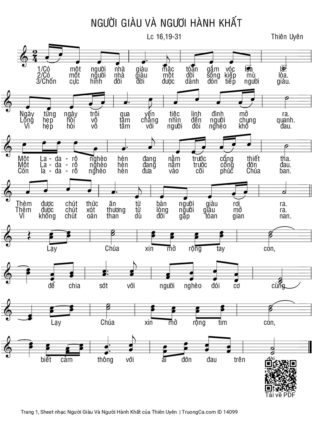 1. Có một người nhà giàu mặc toàn gấm vóc lụa là. Ngày từng ngày trôi qua yến tiệc linh đình mở ra. Một La-da-rô nghèo hèn đang nằm trước cổng thiết tha. Thèm được chút thức ăn từ bàn người giàu rơi ra.
