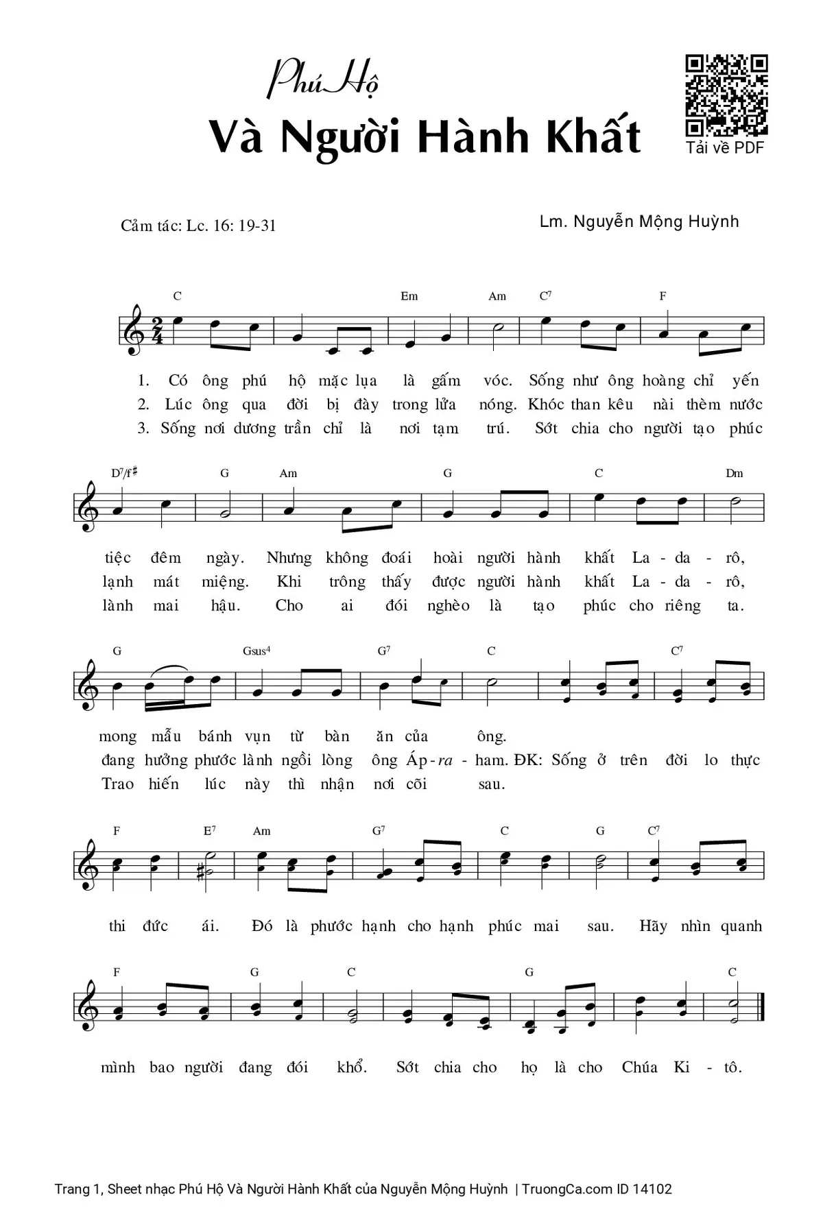 1. Có ông phú hộ mặc lụa là gấm vóc. Sống như ông hoàng chỉ yến tiệc đêm ngày. Nhưng không đoái hoài người hành khất La-da-rô, mong mẫu bánh vụn từ bàn ăn của ông.