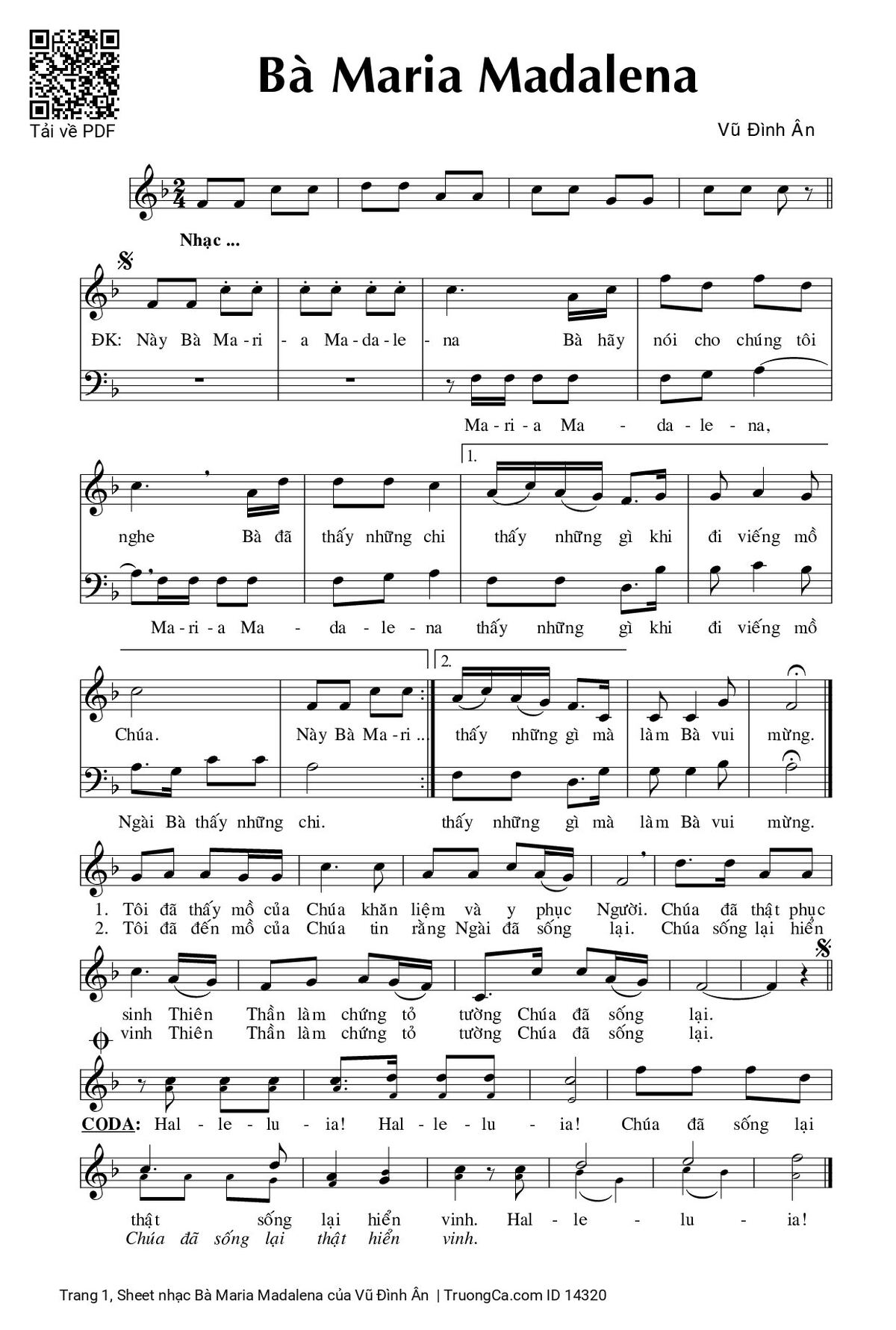Điệp khúc. Này bà Ma-ri-a Ma-da-le-na. Bà hãy nói cho chúng tôi nghe, bà đã thấy những chi, thấy những gì khi đi viếng mồ Chúa. Này bà Ma-ri-a Ma-da-le-na. Bà hãy nói cho chúng tôi nghe, bà đã thấy những chi, thấy những gì mà làm bà vui mừng.
