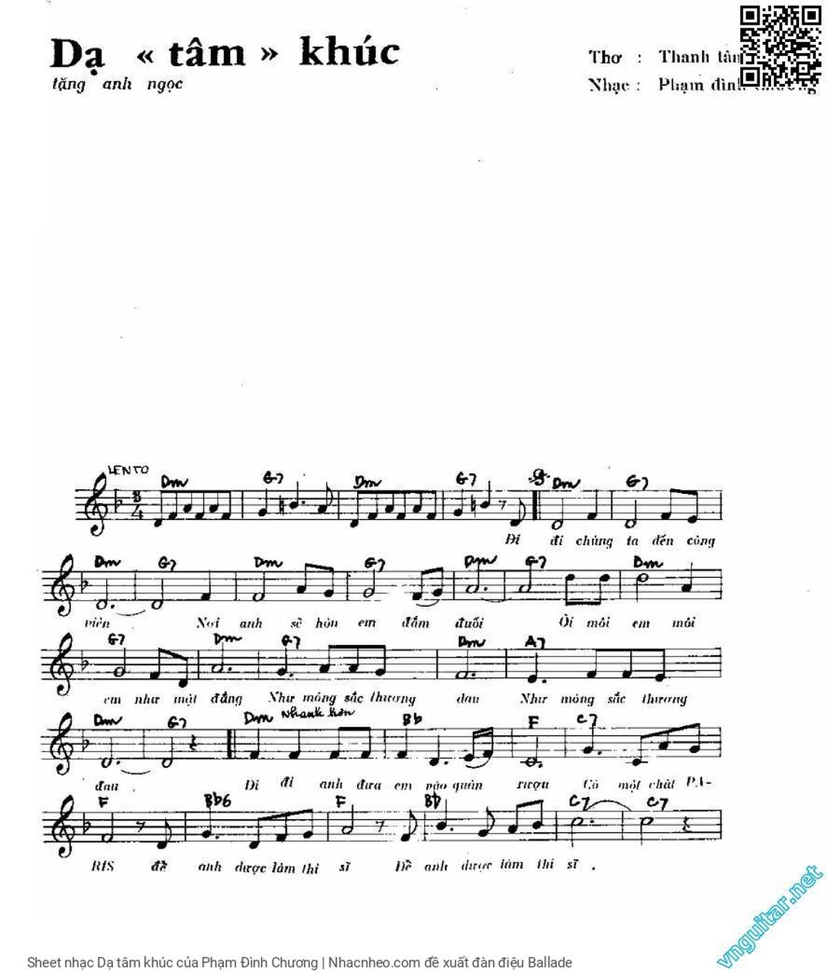 Chọn nút dấu + để tăng tông lên nửa cung, nút dấu - để giảm tông xuống nửa cung. Rê chuột vào hợp âm để xem các thế bấm hợp âm của bài hát Dạ tâm khúc.