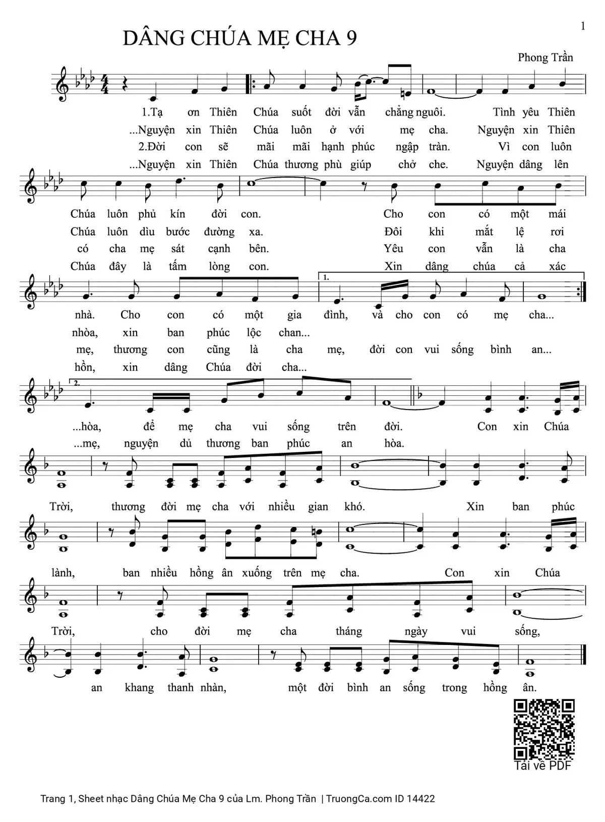 Điệp khúc. Con xin Chúa Trời, thương đời mẹ cha với nhiều gian khó. Xin ban phúc lành, ban nhiều hồng ân xuống trên mẹ cha. Con xin Chúa Trời, cho đời mẹ cha tháng ngày vui sống, an khang thanh nhàn, một đời bình an sống trong hồng ân.