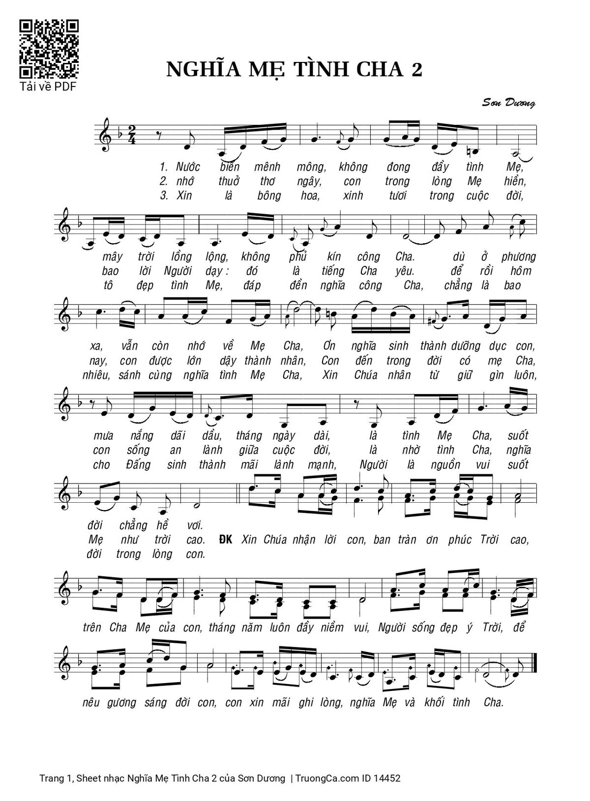 Điệp khúc. Xin Chúa nhận lời con, ban tràn ơn phúc Trời cao, trên Cha Mẹ của con, tháng năm luôn đầy niềm vui, Người sống đẹp ý Trời, để nêu gương sáng đời con, con xin mãi ghi lòng, nghĩa Mẹ và khối tình Cha.