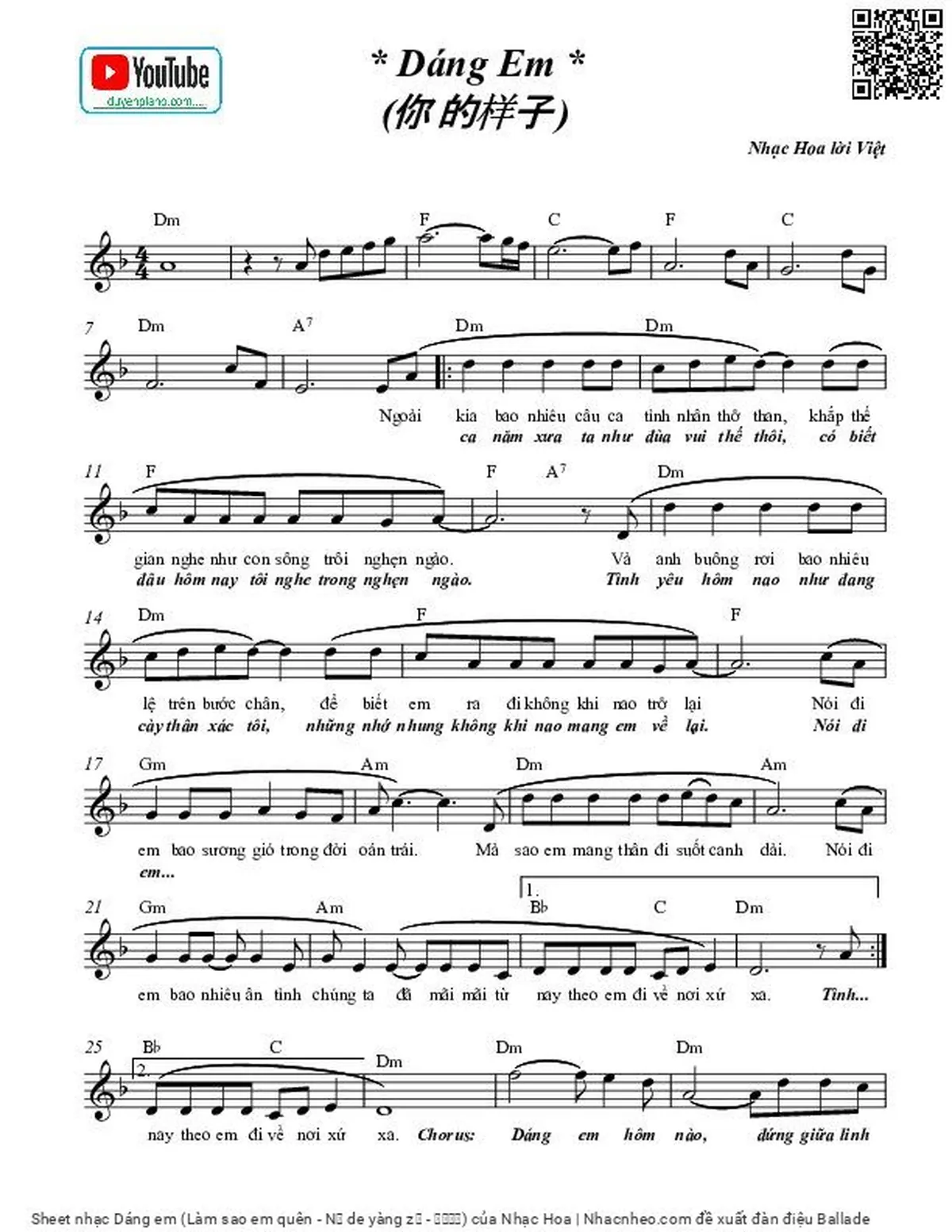 Nhạc Hoa Phiên bản Dáng em lời Việt Nguyễn Văn Thanh Nhã [PDF] [Sheet] [Lời H.A] [Mp4/Midi]