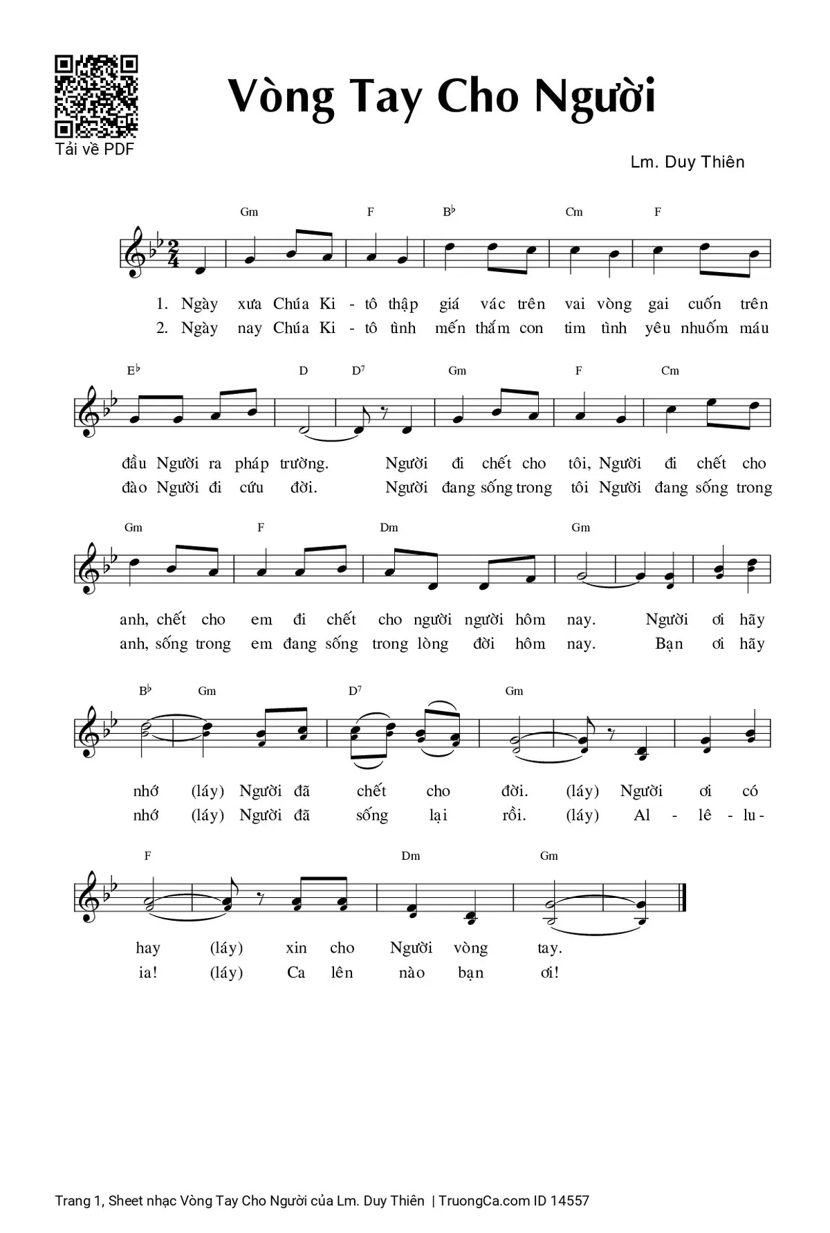 1. Ngày xưa Chúa Kitô, thập giá vác trên vai, vòng gai quấn trên đầu Người ra pháp trường. Người đi chết cho ai? Người đi chết cho anh, chết cho em, chết cho người đời hôm nay. Người ơi có nhớ, Người đã chết cho đời. Bạn ơi có hay, xin cho Người vòng tay.