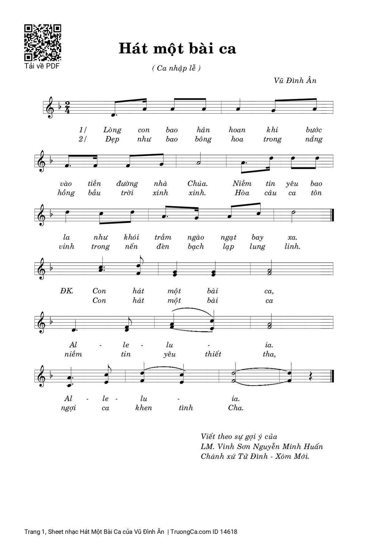 Điệp khúc. Con hát một bài ca, Al-le-lu-ia. Al-le-lu-ia. Con hát một bài ca niềm tin yêu thiết tha, ngợi ca khen tình Cha.