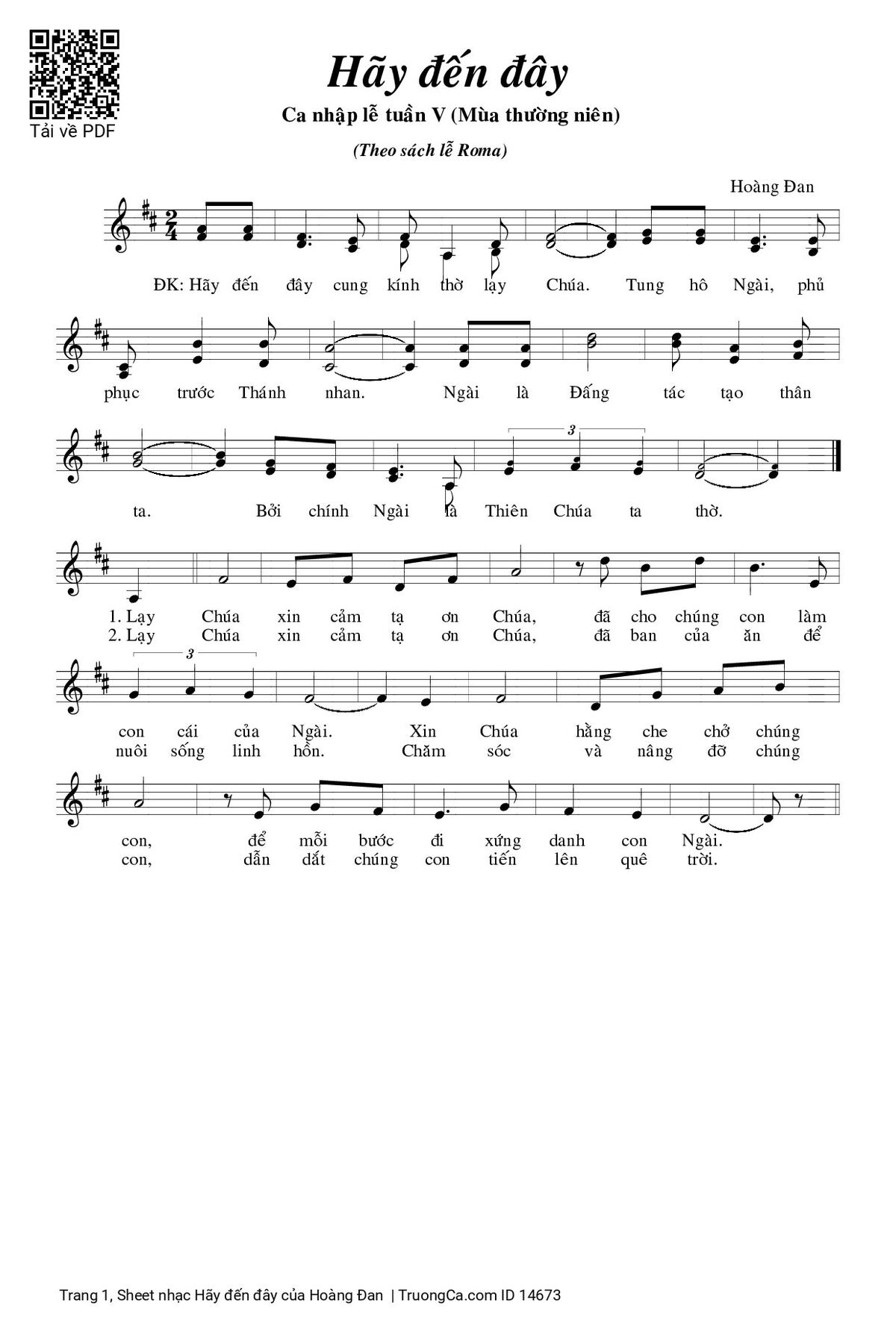 Điệp khúc. Hãy đến đây cung kính thờ lạy Chúa. Tung hô Ngài, phủ phục trước Thánh nhan. Ngài là Đấng tác tạo thân ta. Bởi chính Ngài là Thiên Chúa ta thờ.
