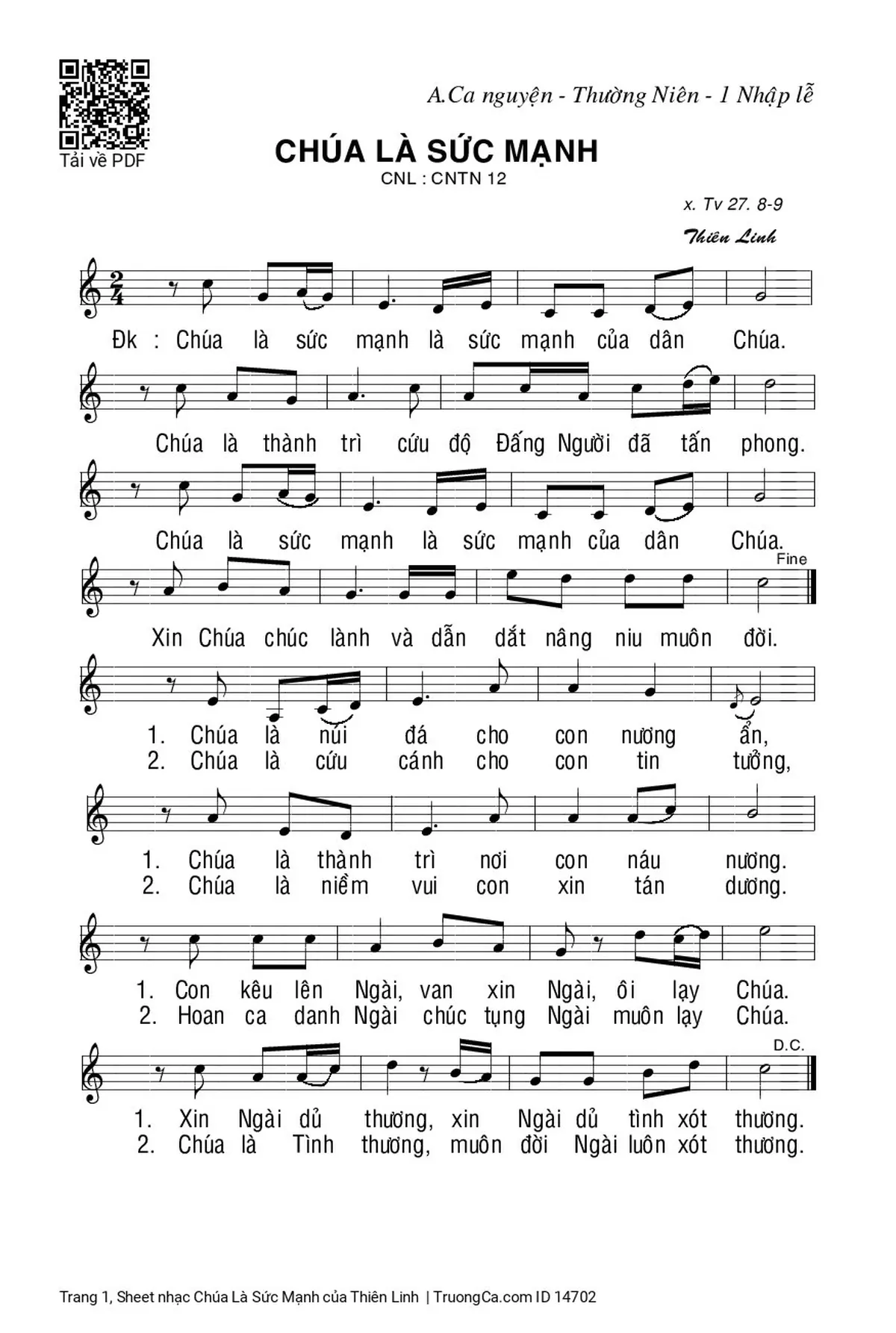 Điệp khúc. Chúa là sức mạnh, là sức mạnh của dân Chúa. Chúa là thành trì cứu độ Đấng Người đã tấn phong. Chúa là sức mạnh, là sức mạnh của dân Chúa. Xin Chúa chúc lành và dẫn dắt nâng niu muôn đời.
