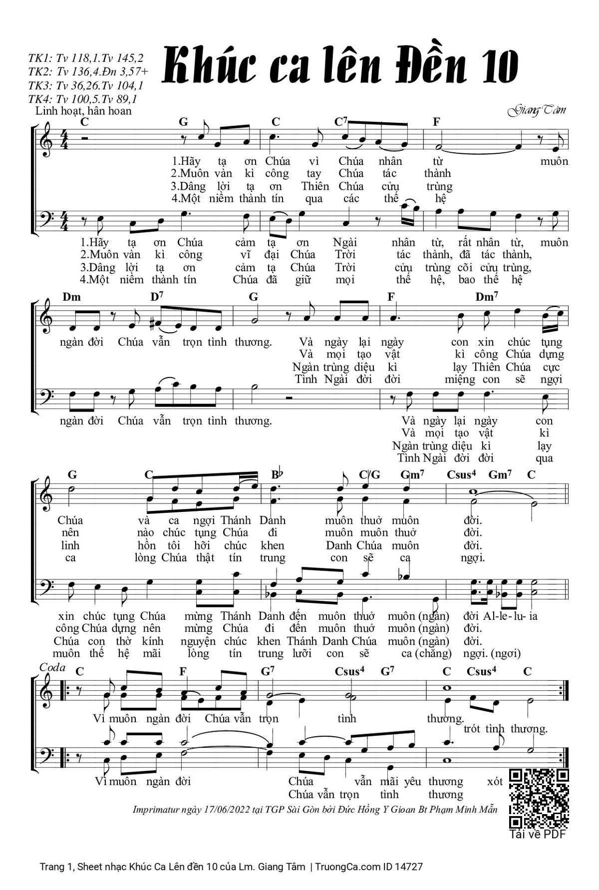 3/ (Dâng lời tạ ơn) Dâng lời tạ ơn Thiên Chúa cửu trùng (cõi cửu trùng) muôn ngàn đời Chúa vẫn trọn tình thương. Ngàn trùng diệu kì lạy Thiên Chúa cực linh hồn tôi hỡi chúc khen Danh Chúa muôn đời. (Allêluia)