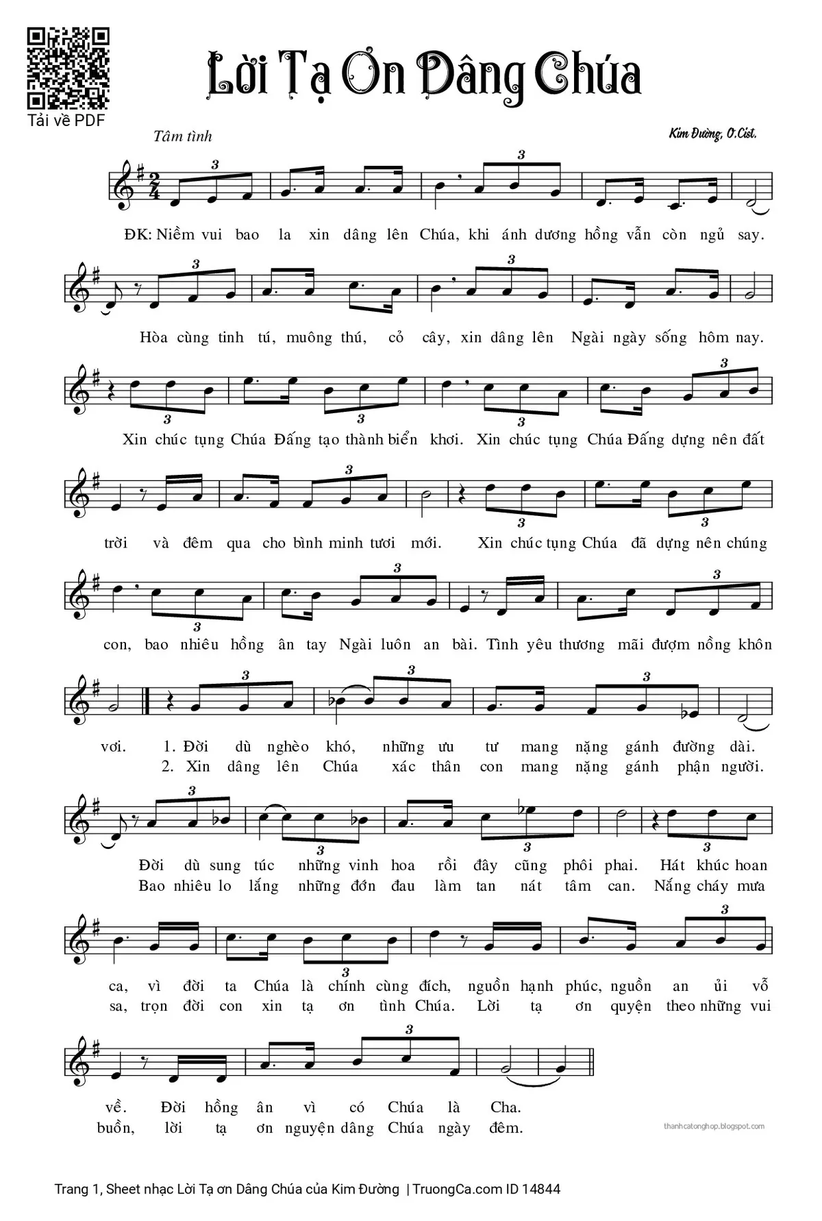 2. Xin dâng lên Chúa xác thân con mang nặng gánh phận người. Bao nhiêu lo lắng những đớn đau làm tan nát tâm can. Nắng cháy mưa sa, trọn đời con xin tạ ơn tình Chúa. Lời tạ ơn quyện theo những vui buồn, lời tạ ơn nguyện dâng Chúa ngày đêm.
