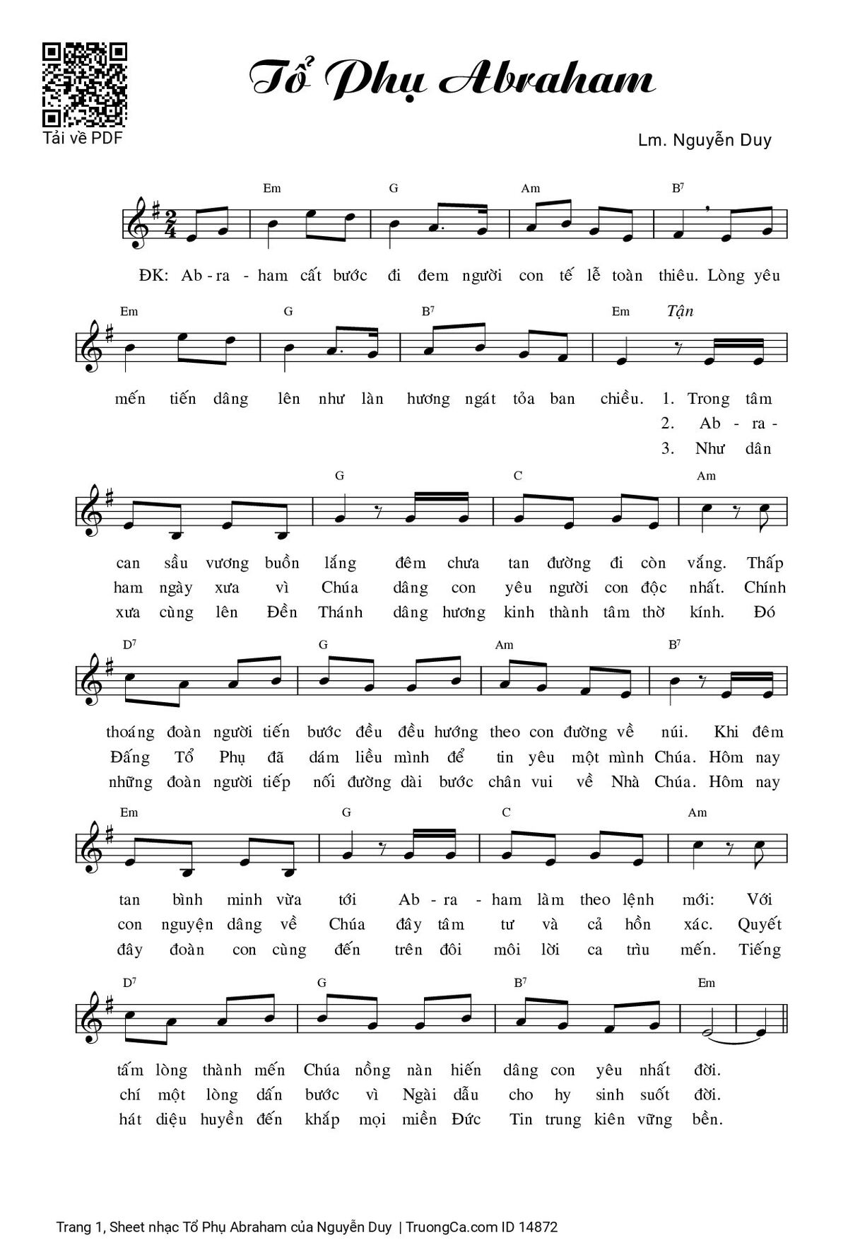Điệp khúc. Ab-ra-ham cất bước đi đem người con tế lễ toàn thiêu. Lòng yêu mến tiến dâng lên như làn hương ngát tỏa ban chiều.
