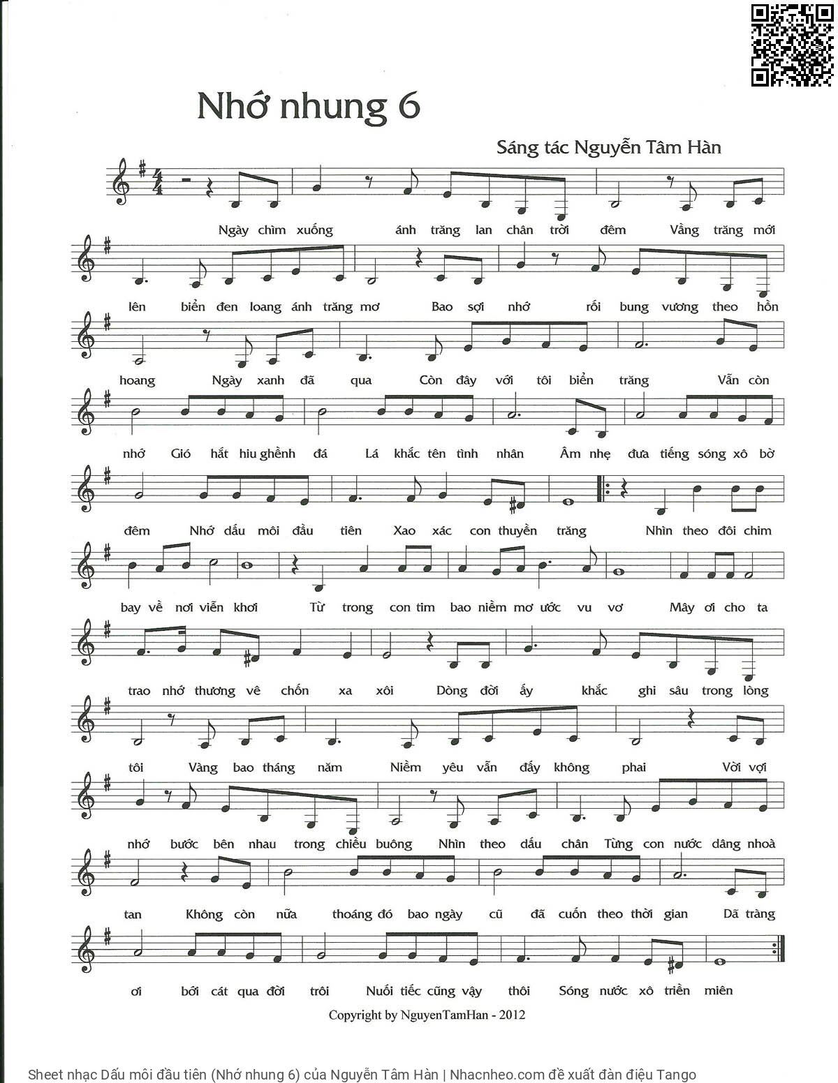Chọn nút dấu + để tăng tông lên nửa cung, nút dấu - để giảm tông xuống nửa cung. Rê chuột vào hợp âm để xem các thế bấm hợp âm của bài hát Dấu môi đầu tiên (Nhớ nhung 6).