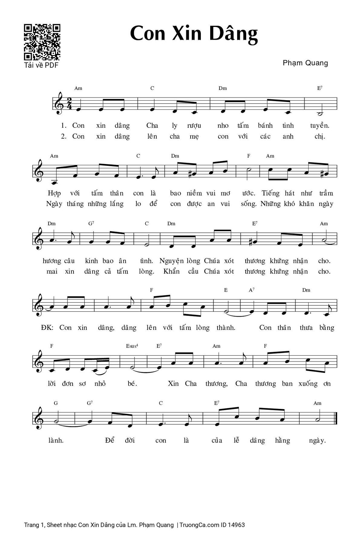 Điệp khúc. Con xin dâng, dâng lên với tấm lòng thành. Con thân thưa bằng đời đơn sơ nhỏ bé. Xin Cha thương, Cha thương ban xuống ơn lành. Để đời con là của lễ dâng hằng ngày.