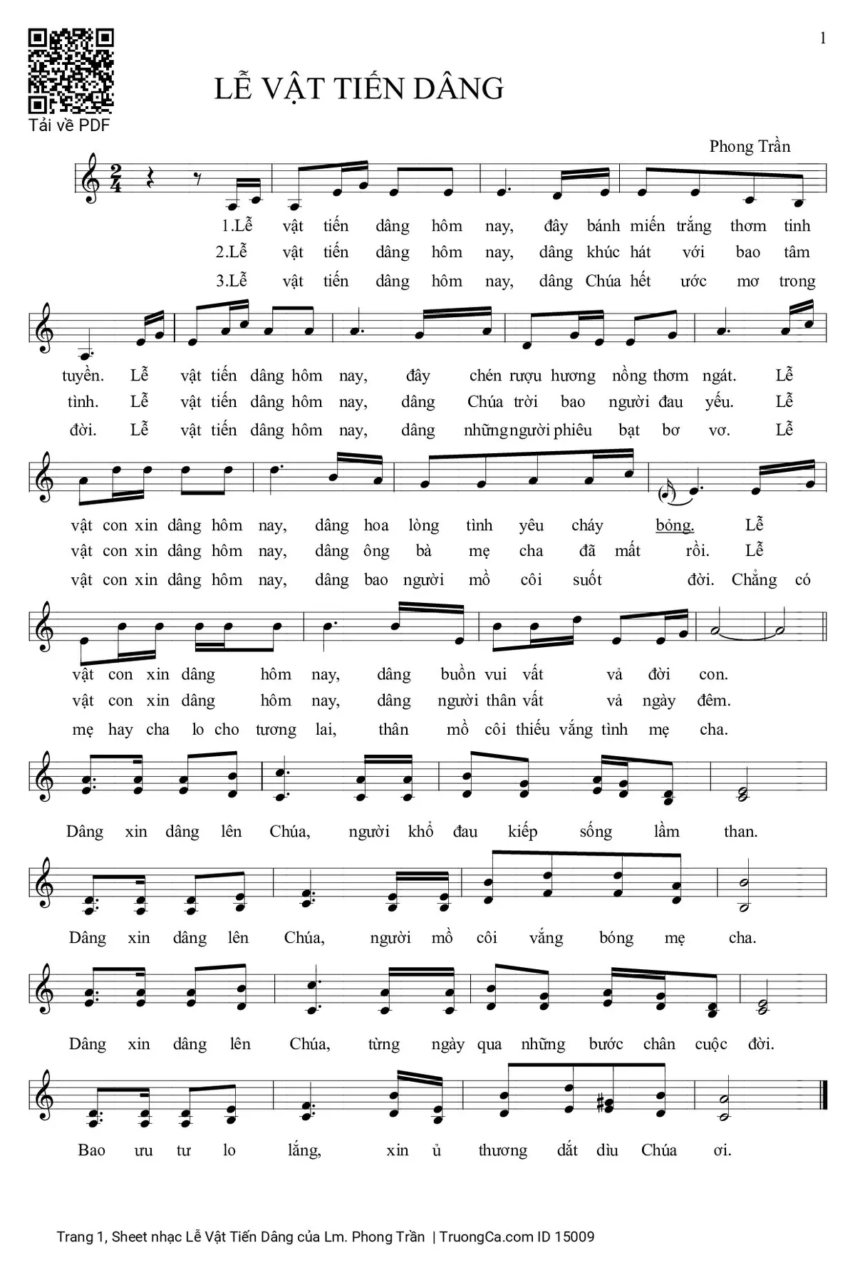 2. Lễ vật tiến dâng hôm nay dâng khúc hát với bao tâm tình. Lễ vật tiến dâng hôm nay dâng Chúa Trời bao người đau yếu. Lễ vật con xin dâng hôm nay dâng Ông Bà Mẹ Cha đã mất rồi. Lễ vật con xin dâng hôm nay dâng người thân vất vả ngày đêm