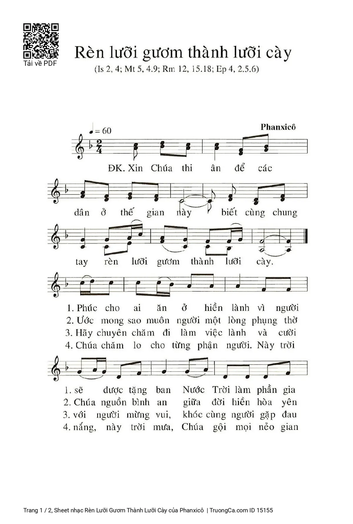 Điệp khúc. Xin Chúa thi ân để các dân ở thế gian này biết cùng chung tay rèn lưỡi gươm thành lưỡi cày.
