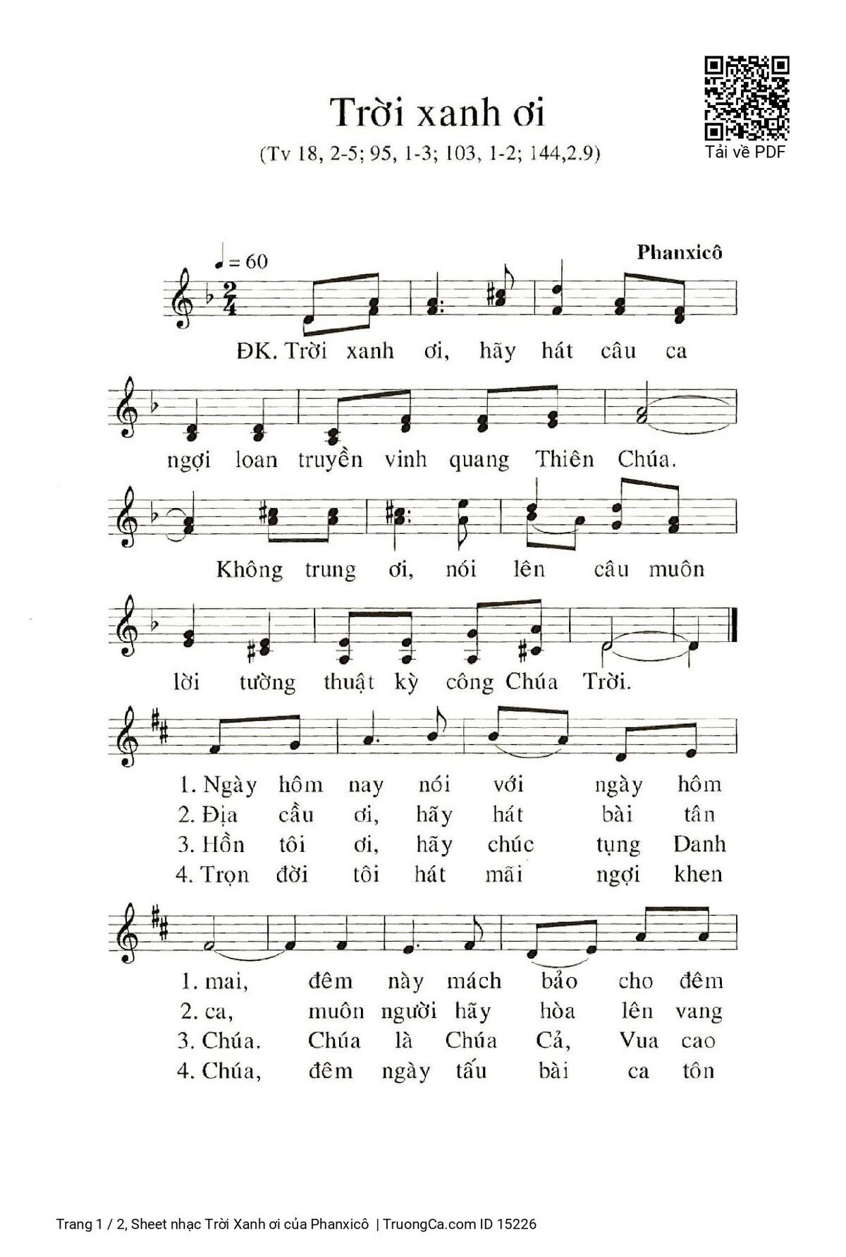 Điệp khúc. Trời xanh ơi, hãy hát câu ca ngợi loan truyền vinh quang Thiên Chúa. Không trung ơi, nói lên câu muôn lời tường thuật kỳ công Chúa Trời.