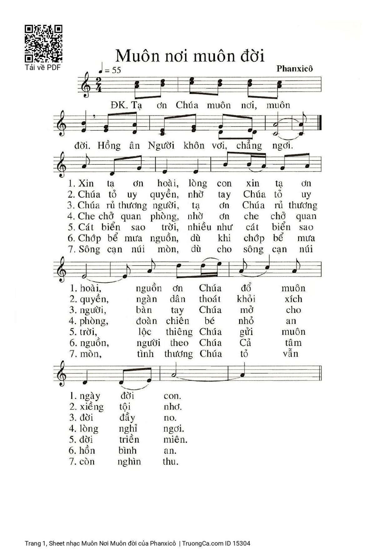 Sheet nhạc có nốt Muôn Nơi Muôn đời của nhạc sĩ Phanxicô và file PDF nốt nhạc đăng lên đây nhằm giúp các bạn xướng âm cho đúng nốt và hát thêm hay, chỉ mang tính chất tham khảo, không có mục đích thương mại. Bản quyền thuộc về tác giả và tổ chức nắm bản quyền, Truongca.com không giữ bất kỳ bản quyền của nội dung nào cả. Các bạn có thể tải về bản PDF chất lượng cao, gồm khuông nhạc có nốt với đường link file PDF bên trên.