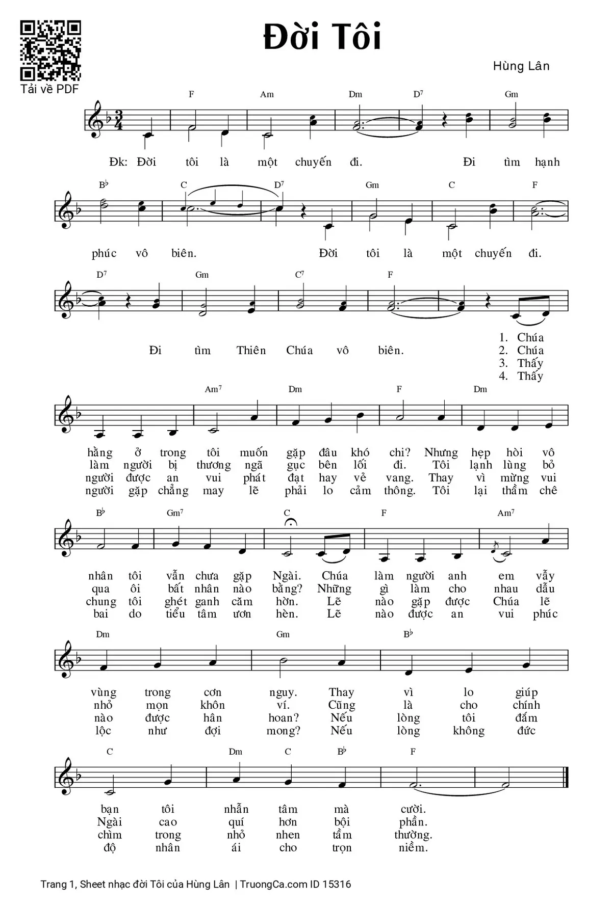Điệp khúc. Đời tôi là một chuyến đi, đi tìm hạnh phúc vô biên. Đời tôi là một chuyến đi, đi tìm Thiên Chúa vô biên