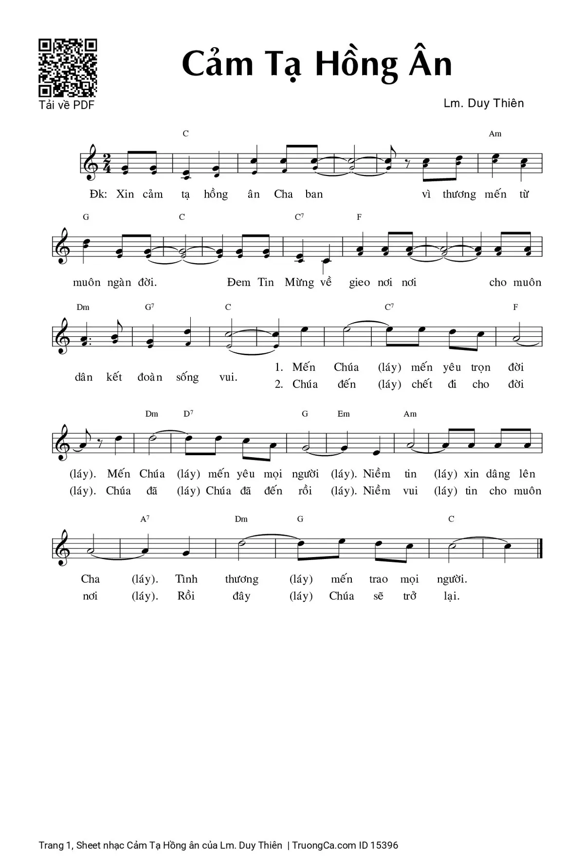 Điệp khúc. Xin cảm tạ hồng ân Cha ban. Vì thương mến từ muôn ngàn đời. Đem Tin Mừng về gieo nơi nơi, cho muôn dân kết đoàn sống vui.