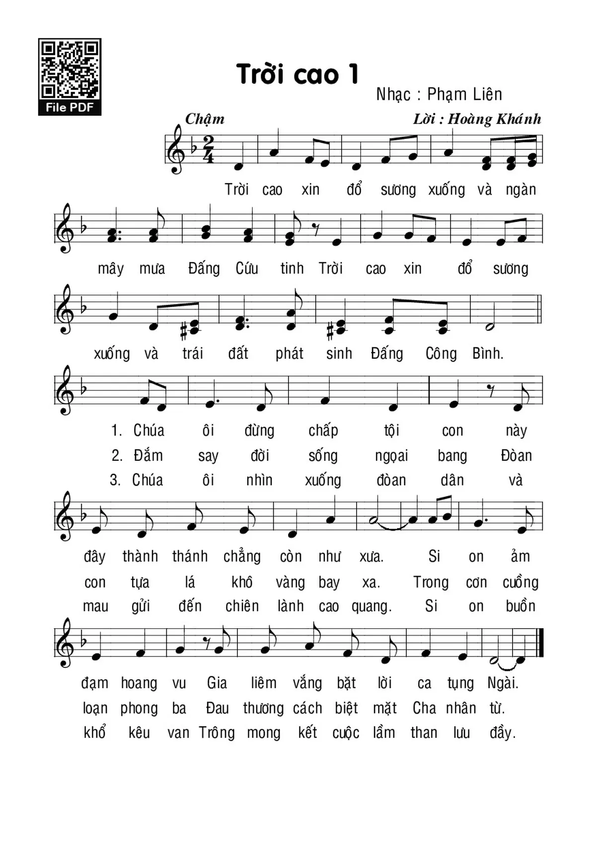 Điệp khúc. Trời cao xin đổ sương xuống và ngàn mây mưa Đấng Cứu Tinh. Trời cao xin đổ sương xuống và trái đất phát sinh Đấng Công Bình.