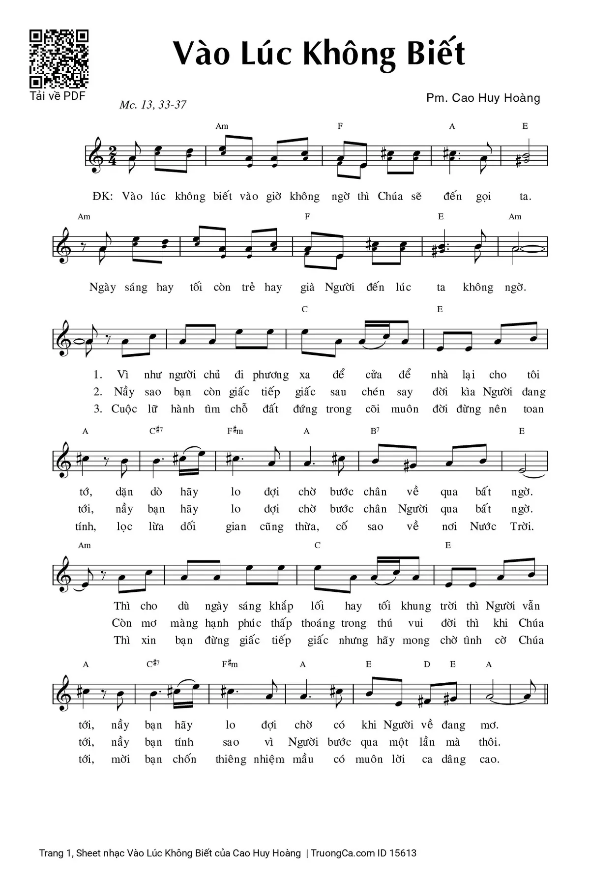 Điệp khúc. Vào lúc không biết vào giờ không ngờ thì Chúa sẽ đến gọi ta. Ngày sáng hay tối còn trẻ hay già Người đến lúc ta không ngờ.