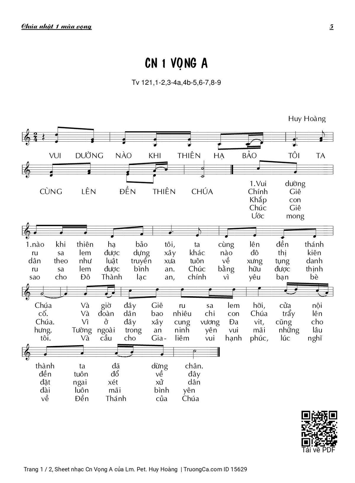 1. Vui dường nào khi thiên hạ bảo tôi, ta cùng lên đền thánh Chúa Và giờ đây Giê ru sa lem hỡi, cửa nội thành ta đã dừng chân.