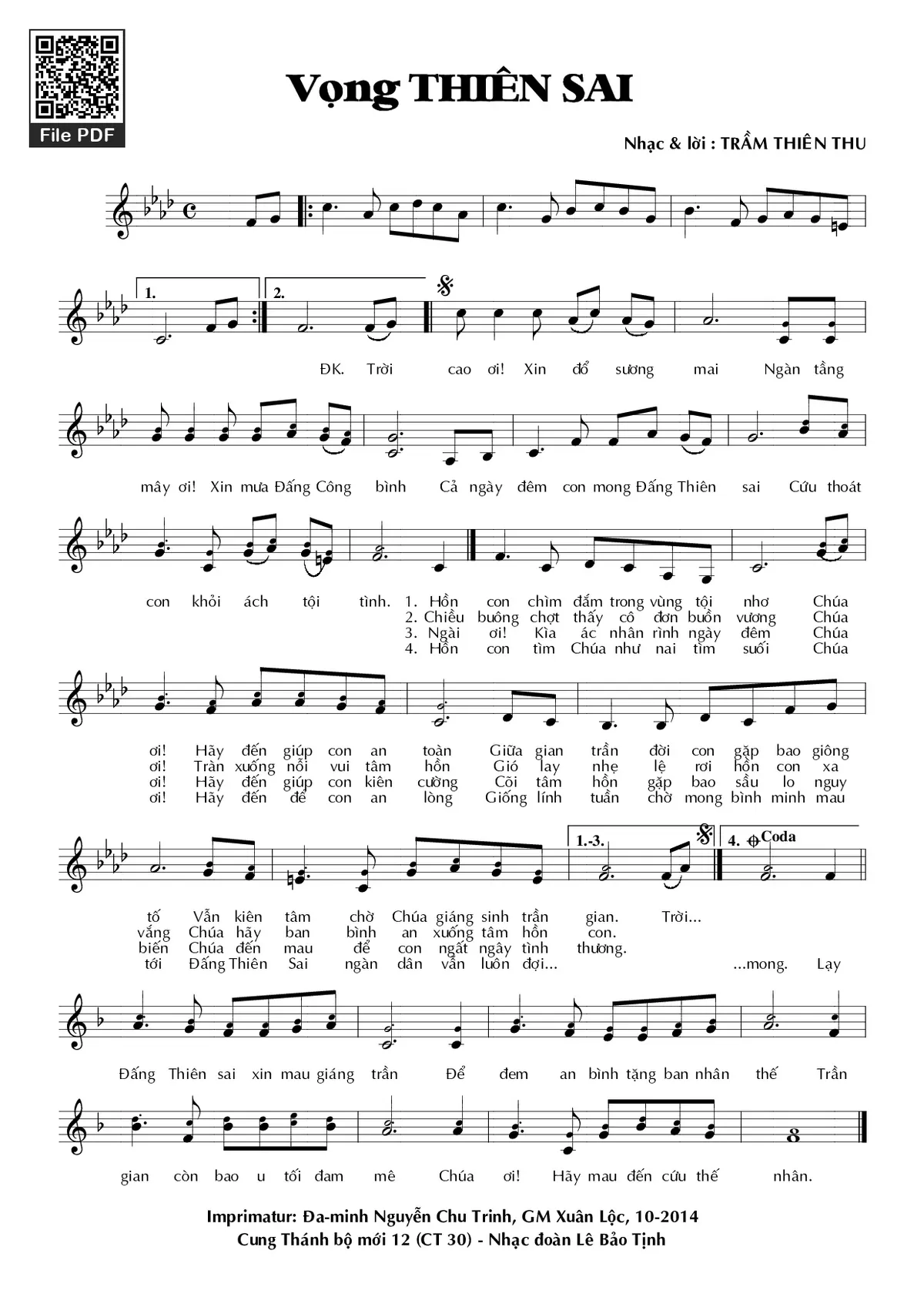 Coda. Lạy Đấng Thiên sai xin mau giáng trần Để đem an bình tặng ban nhân thế Trần gian còn bao u tối đam mê Chúa ơi! Hãy mau đến cứu thế nhân.